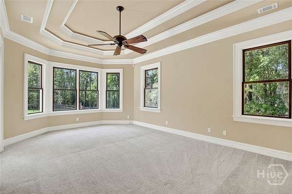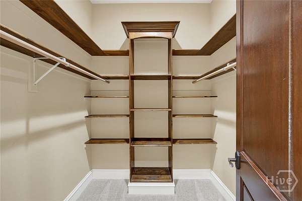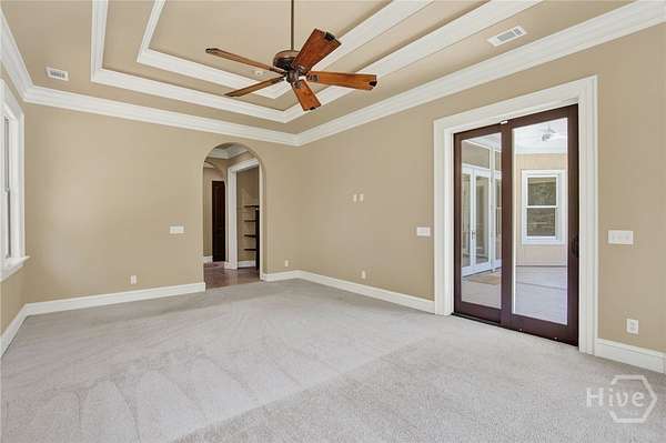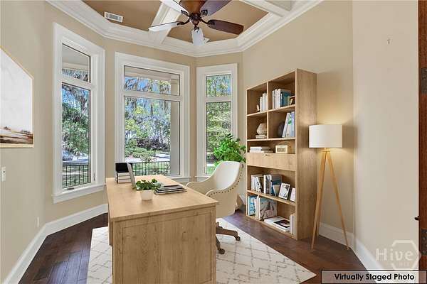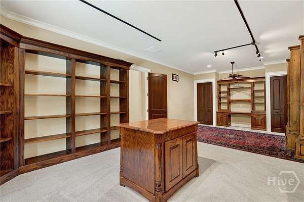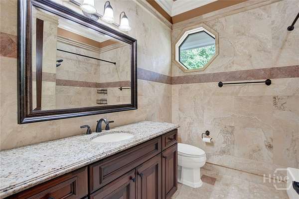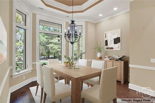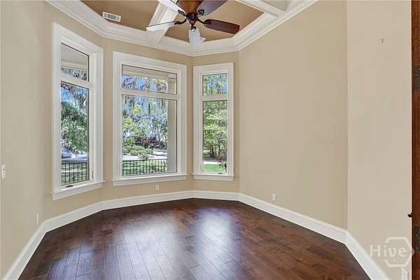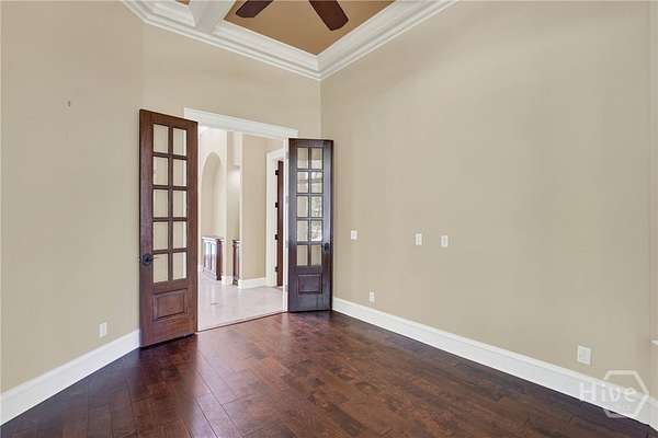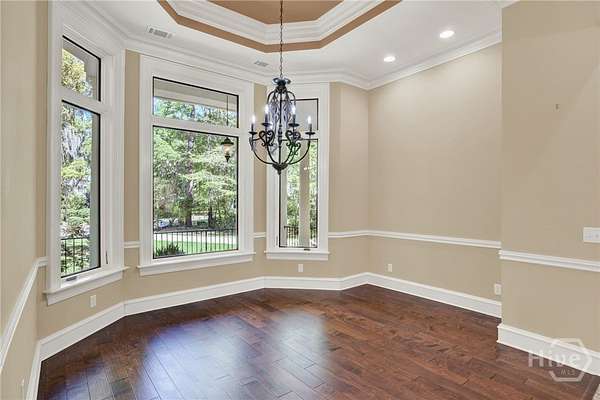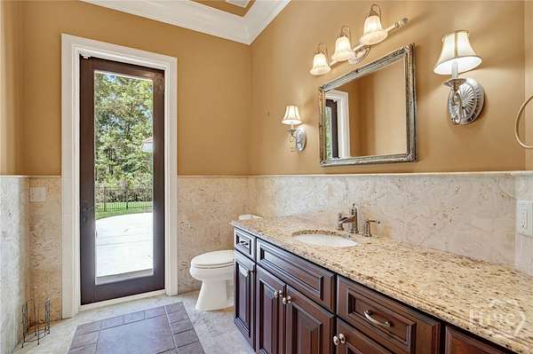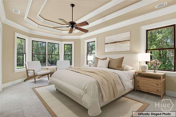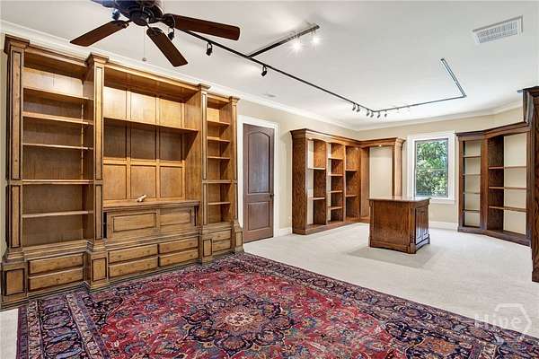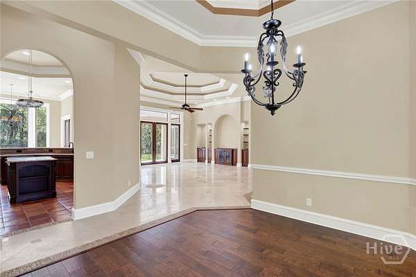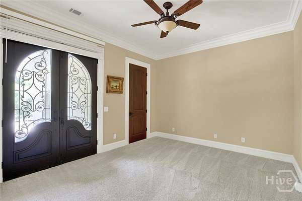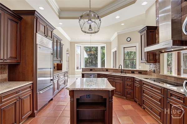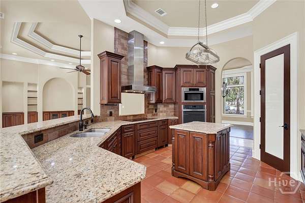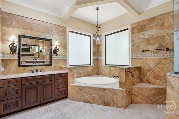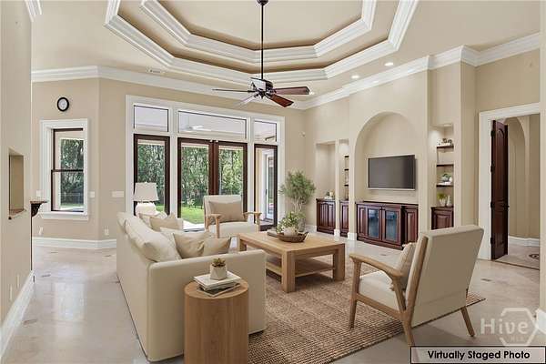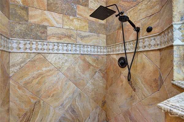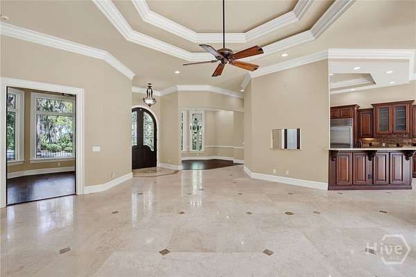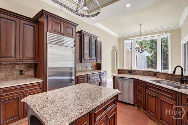 Tucked away at the end of a quiet cul-de-sac on 1.87 acres, this one-of-a-kind retreat blends Mediterranean Coastal architecture with timeless Lowcountry influences. A striking stucco exterior with a classic clay tile roof is set beneath moss-draped oak trees, creating a setting that feels both elegant and serene. Overlooking a tranquil lagoon, the property offers a true escape-just moments from Fish Tales and Fort McAllister Marina. Inside, the home features four bedrooms, 2.5 bathrooms, and a dedicated office, all thoughtfully arranged in a split floor plan for maximum privacy. Soaring 1012' ceilings, expansive windows, 8' solid mahogany doors, travertine flooring, and dramatic stone accent walls create a warm yet sophisticated interior. The kitchen is designed for both everyday living and entertaining, offering granite countertops, a large pantry, induction cooktop, and Sub-Zero refrigerator. The breakfast area overlooks the pool, creating a seamless connection between indoor and outdoor living. The spacious owner's suite enjoys peaceful lagoon views and features a spa-like bath with a large stone shower, rain head, and dual vanities. Each bedroom offers its own exterior access, enhancing the home's connection to its natural surroundings. The oversized fourth bedroom-with custom built-ins-provides flexibility for guests, hobbies, or additional workspace. Step outside to your private backyard oasis, where the expansive covered patio overlooks an 18' x 36' heated saltwater pool (installed in 2025) with elegant fountains, offering the perfect setting for relaxing or entertaining year-round. A shallow well provides irrigation for the grounds, helping maintain the lush landscape efficiently. Additional highlights include a tankless water heater and a four-car garage with epoxy floors, and abundant storage. This is more than a home-it's a private retreat designed for those who appreciate thoughtful design, privacy, and the beauty of coastal living.