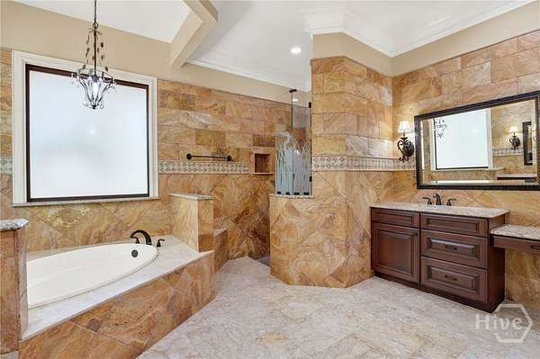 - Bathtub, Breakfast Area, Built-In Features, Cathedral Ceiling(s), Double Vanity, Entrance Foyer, High Ceilings, Kitchen Island, Main Level Primary, Pantry, Pull Down Attic Stairs, Separate Shower, Split Bedrooms, Tray Ceiling(s)