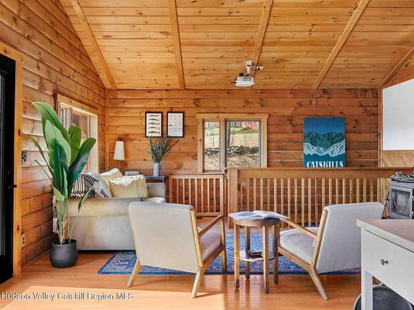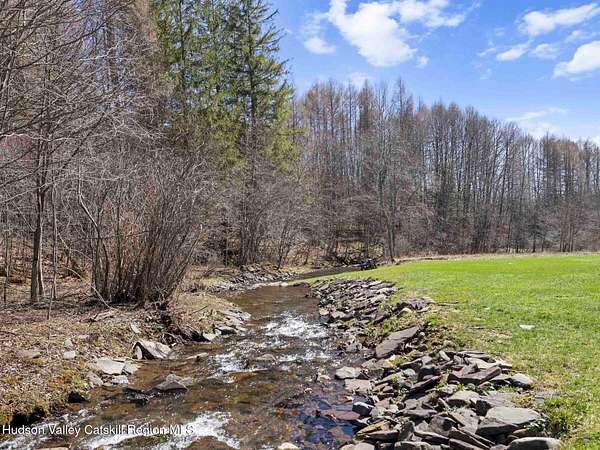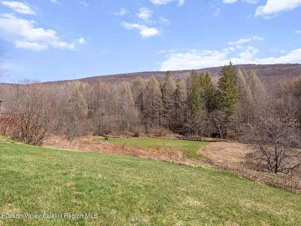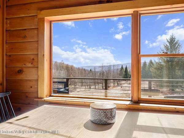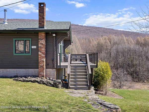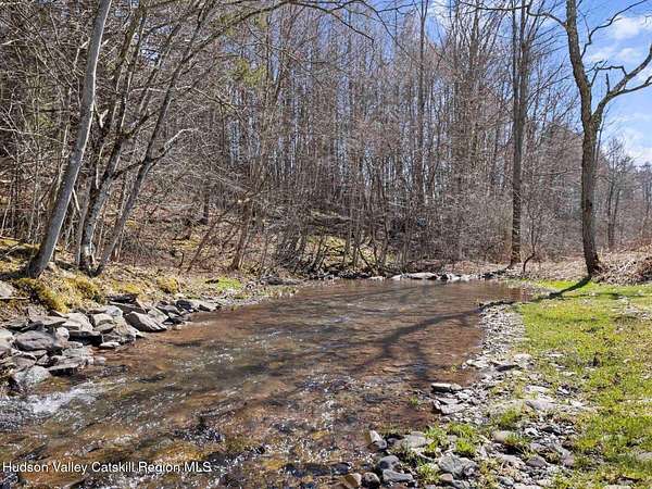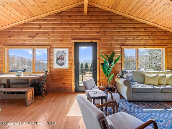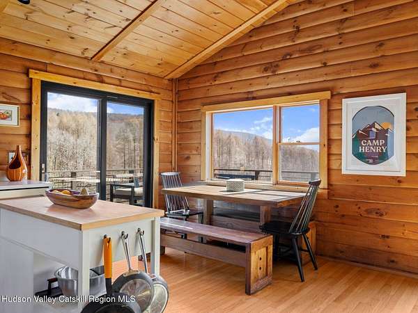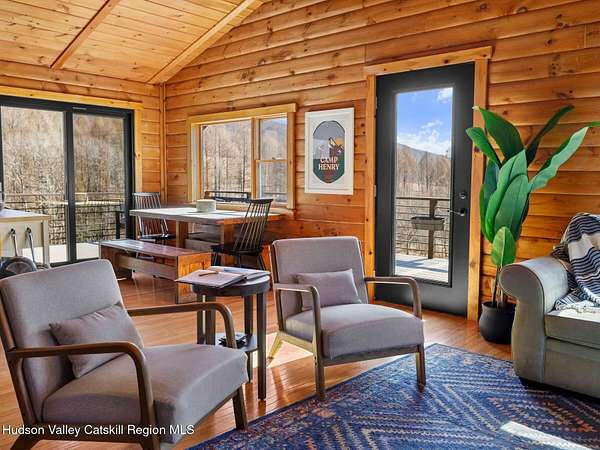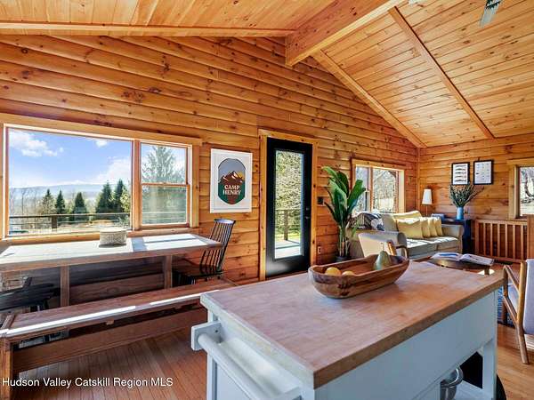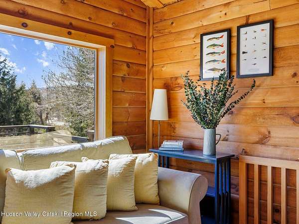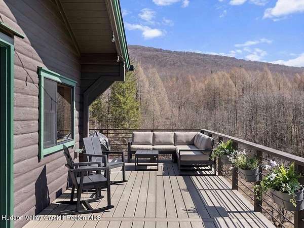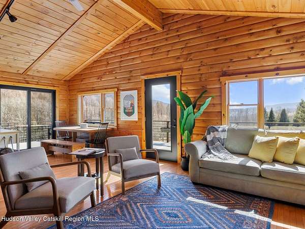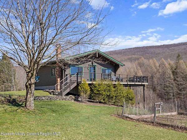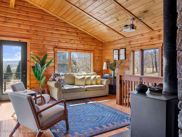 Take the opportunity to own this special piece of the Catskills. This custom-built log cabin offers an exceptional Catskills retreat, situated on five private acres that border over 380 acres of protected land. The property features a stream, sweeping mountain views, and unparalleled privacy and quiet. Outdoor living is in harmony with nature, highlighted by a new, almost 500-square-foot Trex deck; the perfect vantage point to enjoy the sounds of the stream and the mountain scenery, complete with outdoor speakers for ambiance. The interior boasts cozy, open-concept living space with warm wood floors, pine walls and ceilings, and oversized windows that flood the home with natural light. The space is anchored by a charming woodstove and includes a built-in projector system for entertainment. The kitchen maintains a charming rustic aesthetic while featuring updated modern appliances. The thoughtful sleeping quarters include two main-level bedrooms with elegant herringbone inlay floors and a shared full bathroom. The private lower level offers a third bedroom with an ensuite bathroom and walk-out access. This level is highly functional, also featuring a laundry area and significant unfinished space perfect for customization, such as an office, home gym, or media room. The property also features a fresh exterior stain, a gravel driveway, and a convenient storage shed. Recent improvements include a newer roof, new gutters, and a refreshed gravel driveway. This accessible Catskills lifestyle is conveniently located under 15 minutes from the charming towns of Roxbury, Bovina, and Margaretville. Residents can enjoy access to the Roxbury Run pool club (with membership) and both the Plattekill and Belleayre Mountains, all set amid local shops and restaurants. This is a rare, turn-key opportunity for the ultimate mountain getaway. A 3D Walkthrough Tour is available in the digital Lookbook or by request.