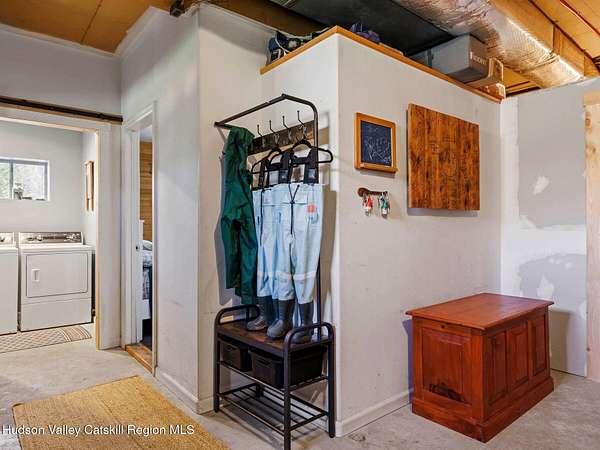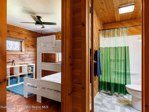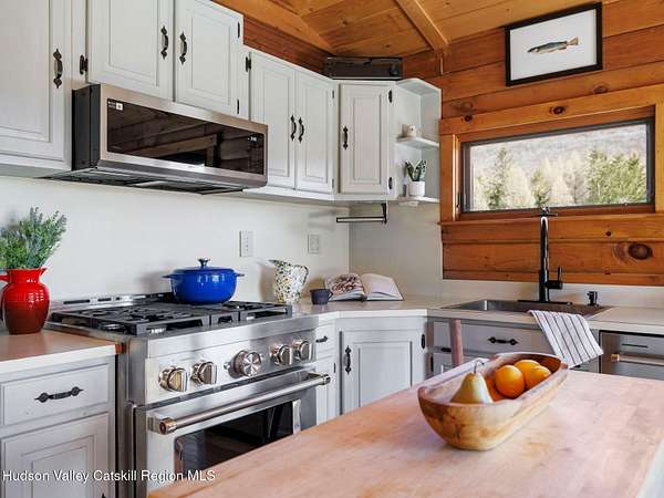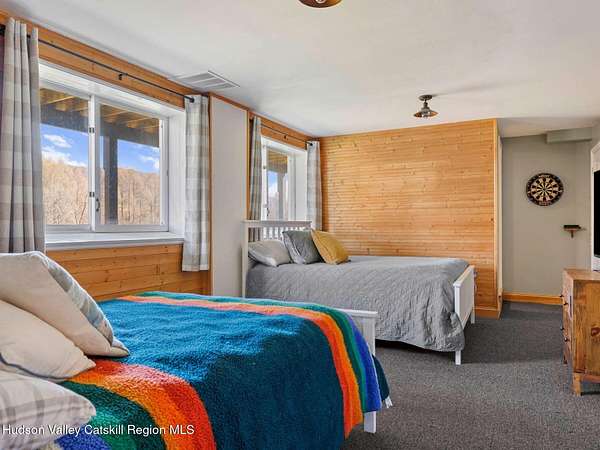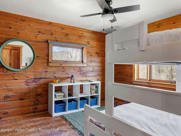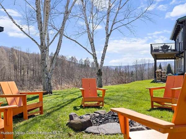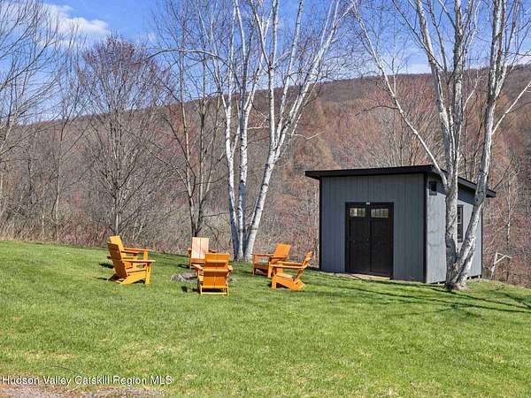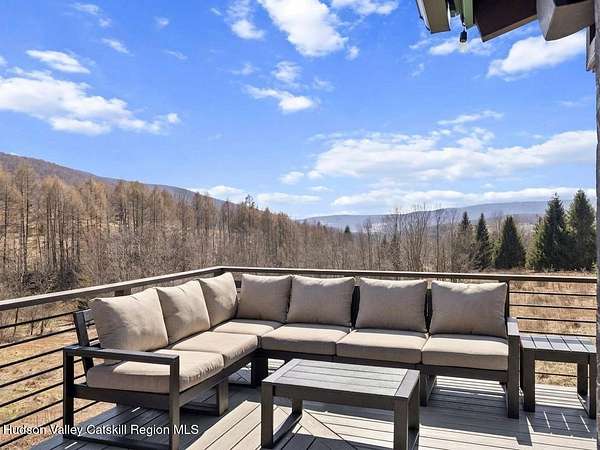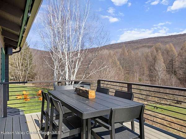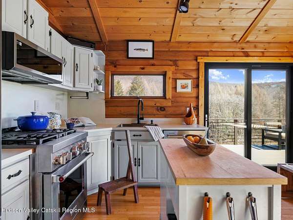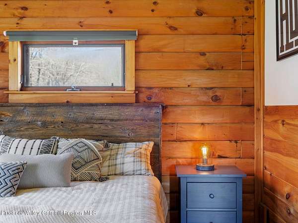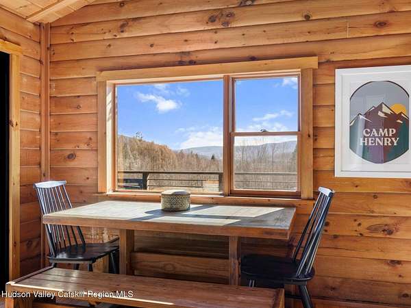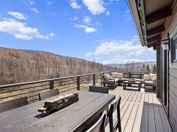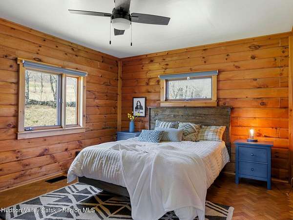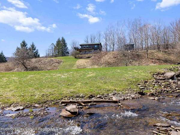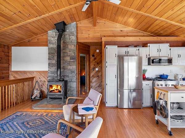 Take the opportunity to own this special piece of the Catskills. This custom-built log cabin offers an exceptional Catskills retreat, situated on five private acres that border over 380 acres of protected land. The property features a stream, sweeping mountain views, and unparalleled privacy and quiet. Outdoor living is in harmony with nature, highlighted by a new, almost 500-square-foot Trex deck; the perfect vantage point to enjoy the sounds of the stream and the mountain scenery, complete with outdoor speakers for ambiance. The interior boasts cozy, open-concept living space with warm wood floors, pine walls and ceilings, and oversized windows that flood the home with natural light. The space is anchored by a charming woodstove and includes a built-in projector system for entertainment. The kitchen maintains a charming rustic aesthetic while featuring updated modern appliances. The thoughtful sleeping quarters include two main-level bedrooms with elegant herringbone inlay floors and a shared full bathroom. The private lower level offers a third bedroom with an ensuite bathroom and walk-out access. This level is highly functional, also featuring a laundry area and significant unfinished space perfect for customization, such as an office, home gym, or media room. The property also features a fresh exterior stain, a gravel driveway, and a convenient storage shed. Recent improvements include a newer roof, new gutters, and a refreshed gravel driveway. This accessible Catskills lifestyle is conveniently located under 15 minutes from the charming towns of Roxbury, Bovina, and Margaretville. Residents can enjoy access to the Roxbury Run pool club (with membership) and both the Plattekill and Belleayre Mountains, all set amid local shops and restaurants. This is a rare, turn-key opportunity for the ultimate mountain getaway. A 3D Walkthrough Tour is available in the digital Lookbook or by request.