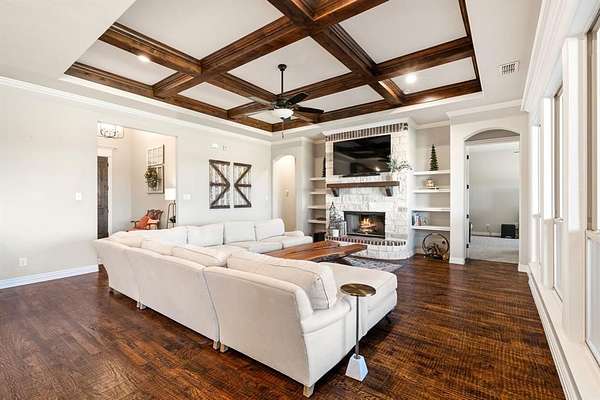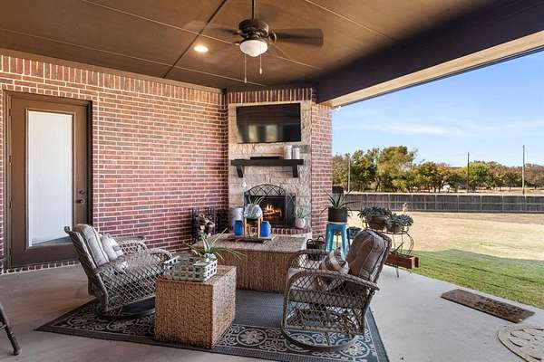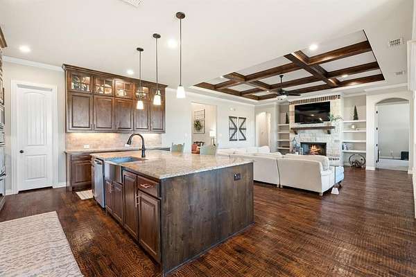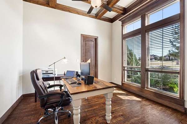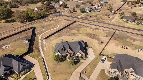 Looking for a move in ready home with space to spread out and no city taxes? This stunning 4 bedroom, 3 bath home offers a flexible layout perfect for multi generational living, remote work, and entertaining. Located on 1.75 acres in a quiet culdesac, it features an open concept floorplan with hand-scraped hardwood floors throughout the living areas and wood coffered ceilings in both the living room and private home office. The heart of the home is a chef's kitchen with a massive granite island, double ovens, and seamless flow into the dining and living spaces. A floor to ceiling stone fireplace makes the spacious living room feel cozy. The primary suite includes a spa like bath with a large utility room that connects directly to the walk in closet; perfect for everyday convenience. The 4th bedroom functions as MIL Suite or flexible living space, complete with its own ensuite bath and walk-in closet. Outside you'll love oversized covered back porch with fireplace that is perfect for outdoor entertaining, grilling, or relaxing under the Texas sky. MIDLO ISD! Must See!