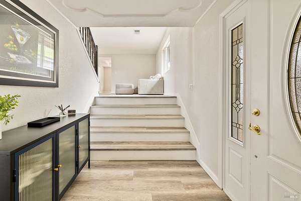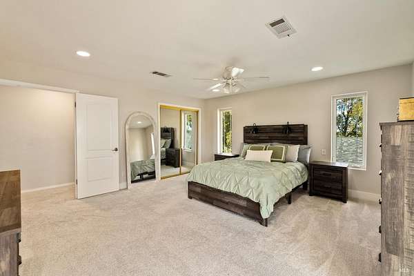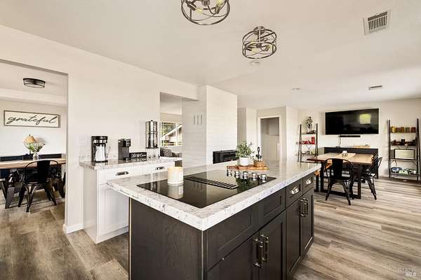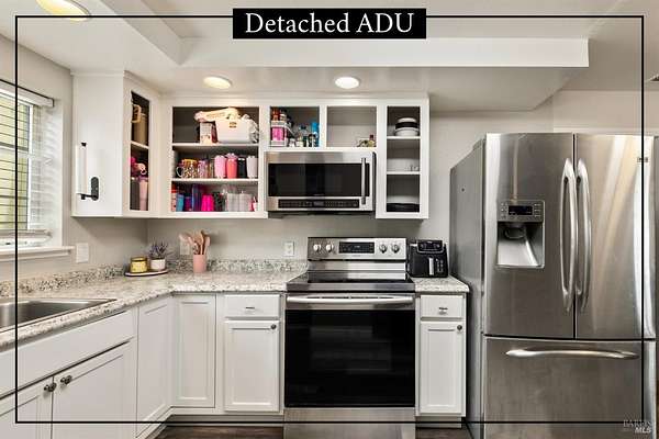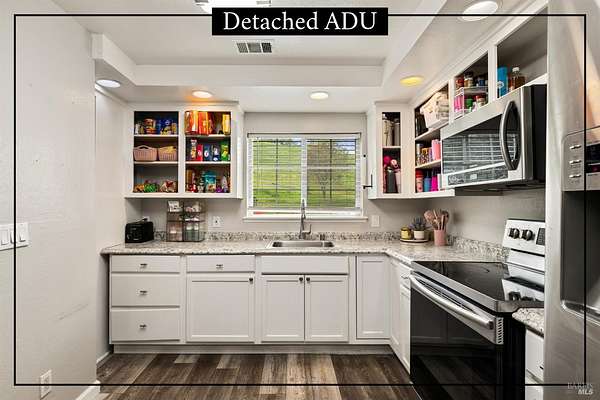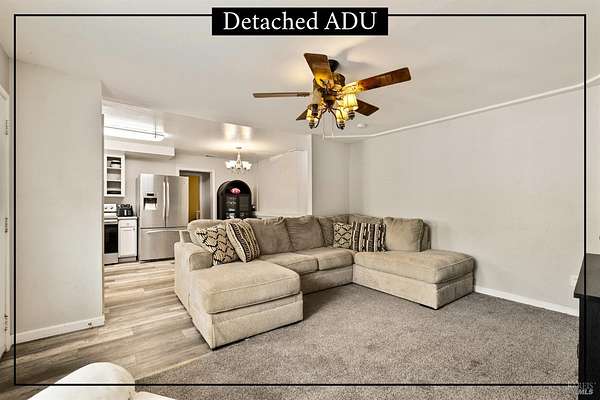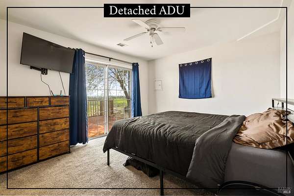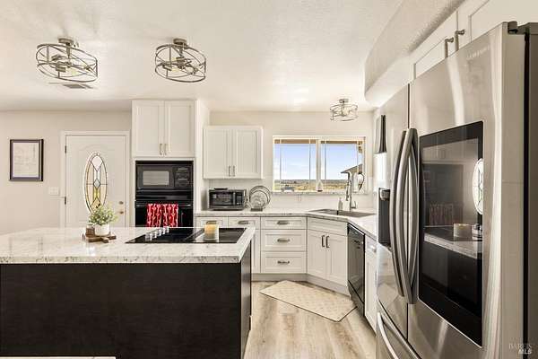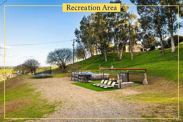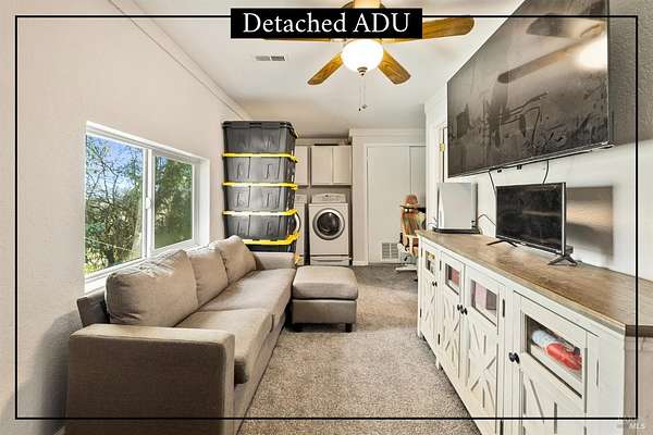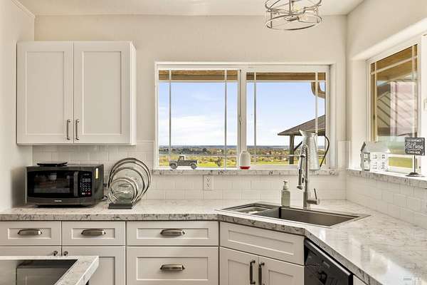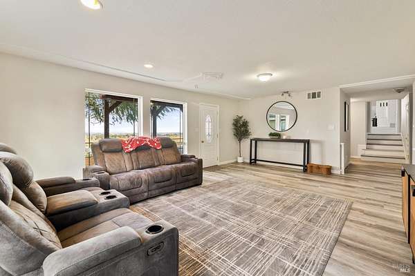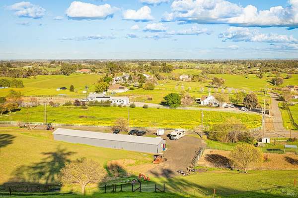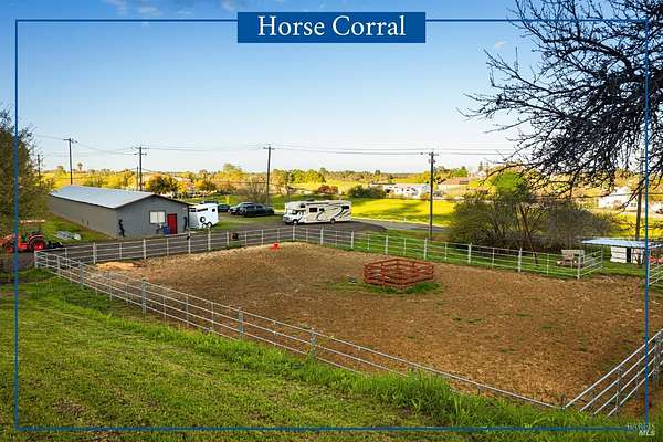 Breathtaking Vacaville country estate set on nearly 6 acres of premium land just 5 miles from downtown, offering privacy, versatility and exceptional views with a total of 4,232 sq ft of living space between two residences. The remodeled custom main home spans 3,052 sq ft with 4 bedrooms and 2.5 bathrooms and showcases spectacular hillside views through numerous dual pane windows. The well-designed floorplan features a formal entry and living room, huge family room, dining room with tray ceiling, and interior laundry with cabinetry. The updated kitchen is designed for both everyday living and entertaining, featuring granite countertops, tile backsplash, an island with bar seating, modern cabinetry, a brick wood burning stove fireplace, and a spacious dining area perfectly positioned to take in the surrounding views. Interior upgrades include updated bathrooms, vinyl plank flooring, newly installed upstairs carpet, modern light fixtures, recessed lighting and ceiling fans throughout. The spacious primary suite offers a private balcony with incredible views and a remodeled ensuite bathroom with dual sink vanity, glass shower and walk-in closet. Outdoor living is exceptional with an above ground pool with deck and gazebo, plus a hilltop entertaining area featuring a huge concrete patio, new gazebo and spa, all surrounded by spectacular views and recently stained decking. Over $100,000 in concrete improvements include the private road leading to the home and expansive patio areas with potential RV parking. The property also includes a freshly painted secondary manufactured home with newer roof offering 3 bedrooms and 2 bathrooms totaling 1,180 sq ft, including approximately 462 sq ft unpermitted originally a carport enclosed with a foundation, with potential rental income of approximately $2,700 per month. Additional features include a massive 24 ft by 100 ft 12 car garage offering potential rental income or future horse stalls, an attached 2 car garage, and an unpermitted 24 ft by 36 ft workshop. The land has recently been excavated to improve usability, is partially fenced, and includes equestrian amenities with a horse corral completed in 2025 and a 50 ft round pen training arena completed in 2026. A rare opportunity to own a private estate combining luxury living, income potential, equestrian amenities and expansive space for recreation, entertaining and future possibilities.