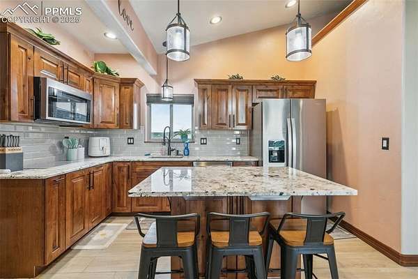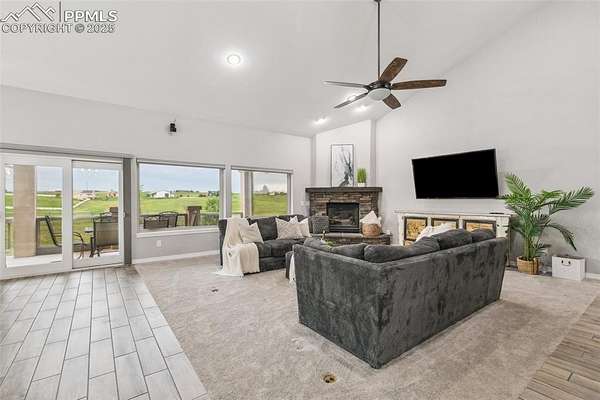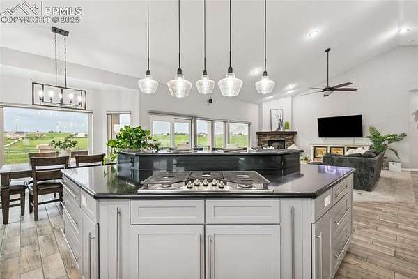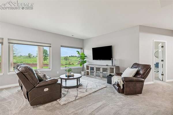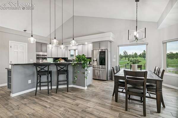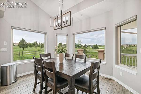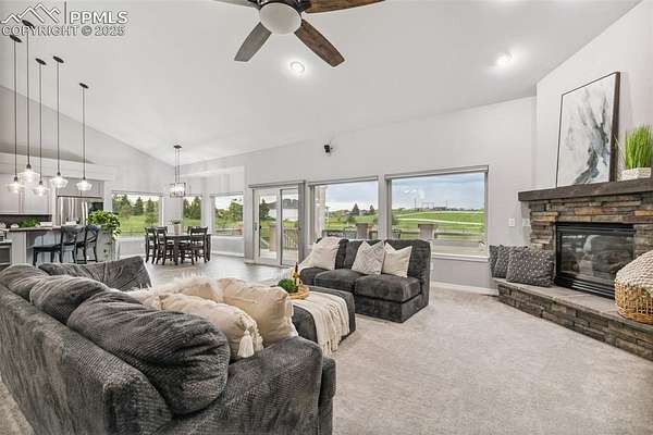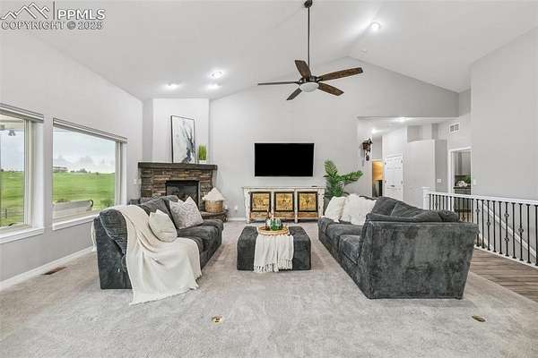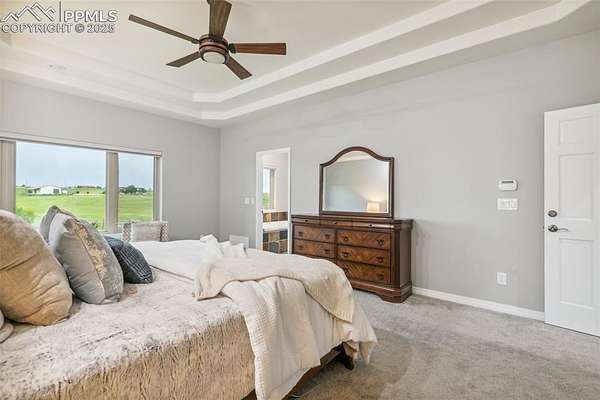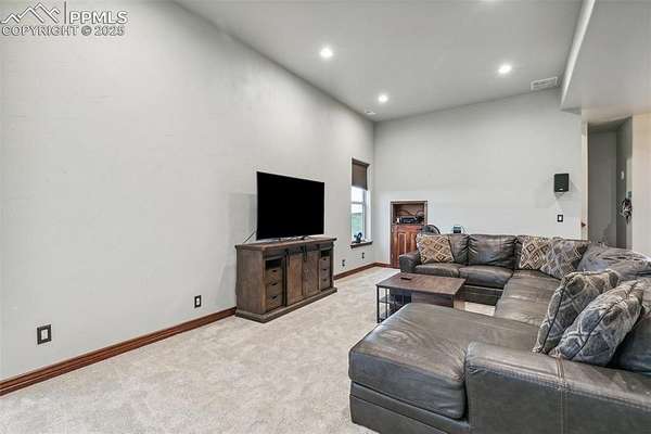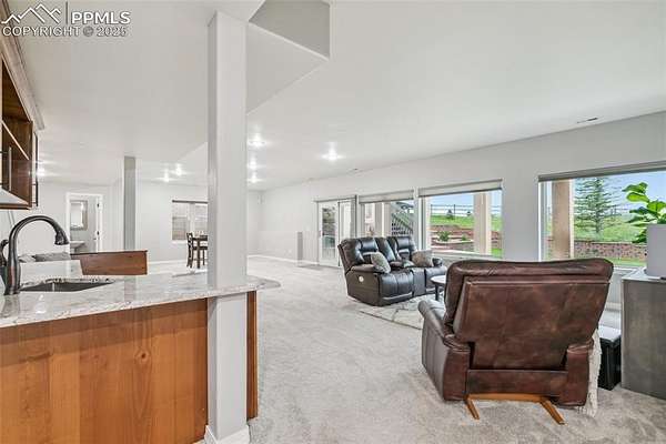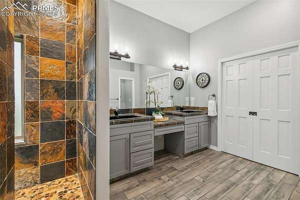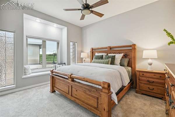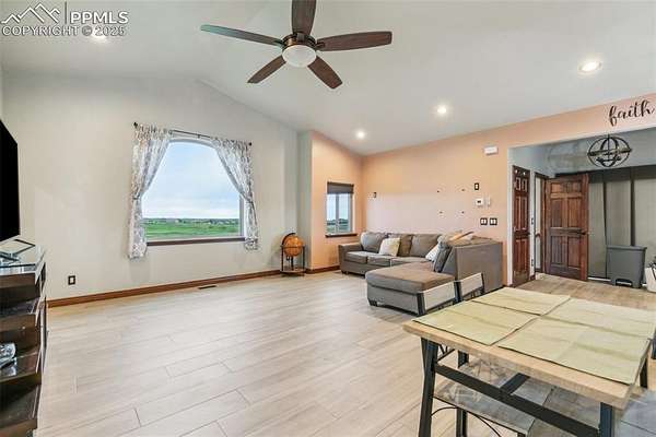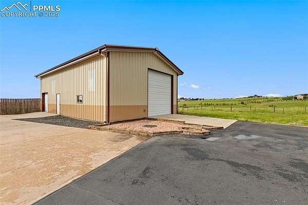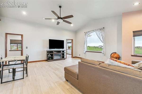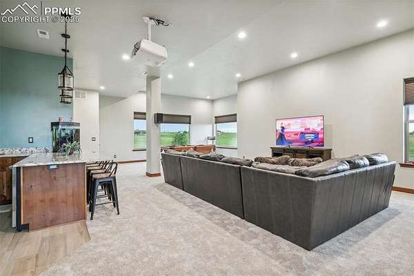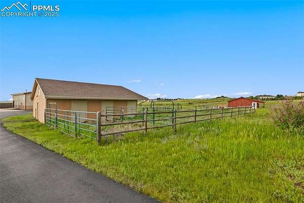 This exceptional Black Forest property features 7,392 sq ft across two distinct residences, connected by a garage, all situated on a 5-acre cul-de-sac lot with breathtaking views of Pikes Peak and the surrounding mountains. The main ranch-style home, 5,284 sq ft, features vaulted ceilings, beautiful flooring, and hand-troweled walls. Its fabulous great room boasts abundant natural light and incredible views. The dream kitchen includes Silestone counters, double ovens, a gas cooktop, maple cabinetry, an island, and a bay dining area with deck access. A formal dining room and a family room with a fireplace and views complete the main living areas. The main level also has two bedrooms, an office, and a laundry room. The sumptuous master bedroom features a double-tray ceiling, expansive views, and a spa-like 5-piece bath with a soaking tub, dual-headed shower, dual vanity, a lighted makeup area, and a grand walk-in closet. The full walk-out basement expands living space with a second master bedroom, a second laundry room, and a massive recreation room featuring a wet bar and French doors that open to the patio. Two more bedrooms with a Jack and Jill bath are also downstairs. The spacious basement family room has a wet bar with seating, dishwasher, sink, and beverage fridge. The second residence, a 2,108 sq ft two-story addition, is ideal for multi-generational living with private access. Its lower level features a recreation, gaming, and media room with a half bath and laundry facilities, while the upper level offers a large living space, a full kitchen, and two bedrooms. This property is a dream for equestrians and a delight for hobbyists. It features a heated, oversized 3-car garage and an exceptionally huge, insulated 30x50 RV garage with lofted storage, workbench, 50-amp power, and house-controlled heating. A 3-stall barn with electricity and a fenced yard is ideal for horses. Truly a must-see for luxurious, spacious, and versatile living with unparalleled views.