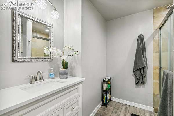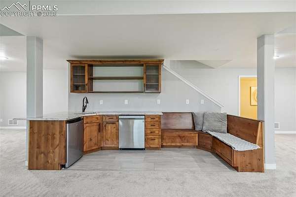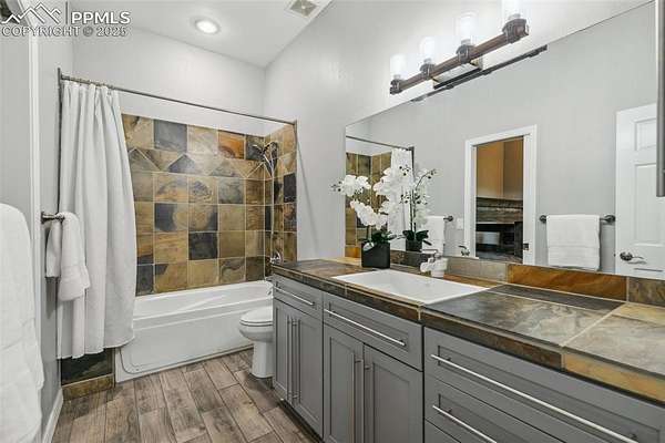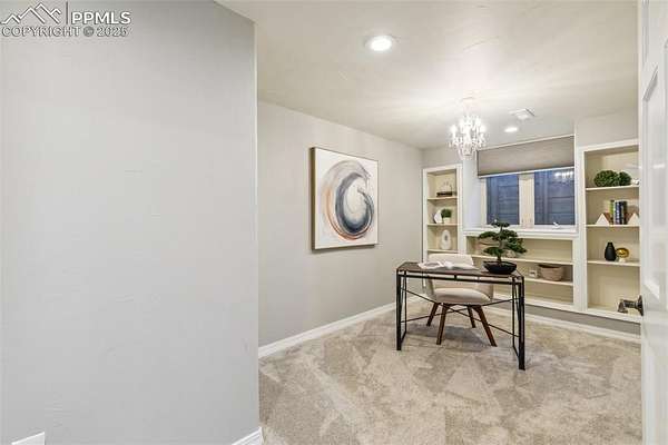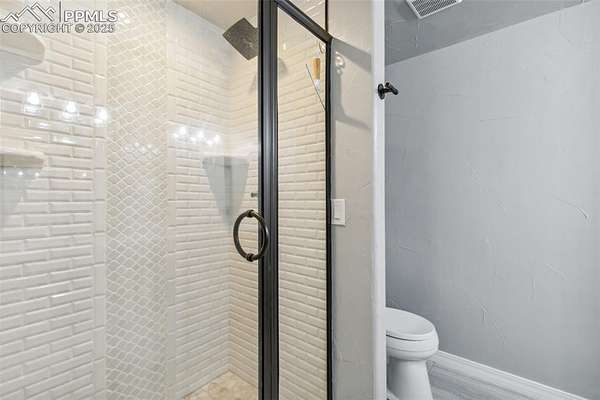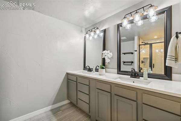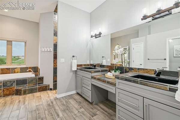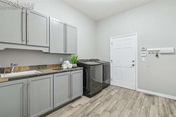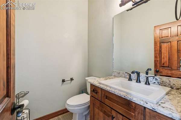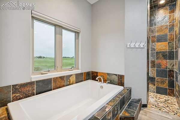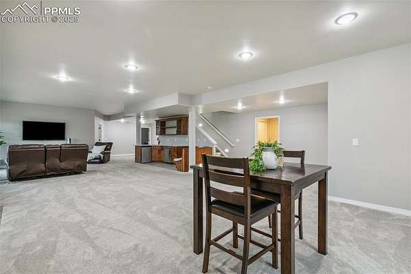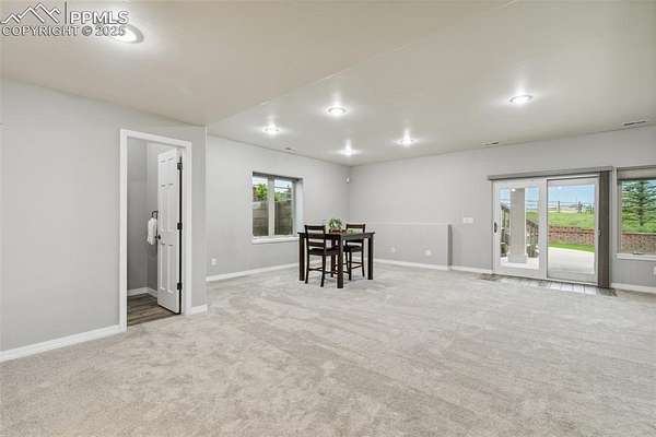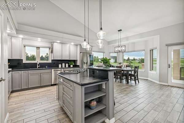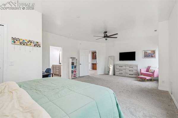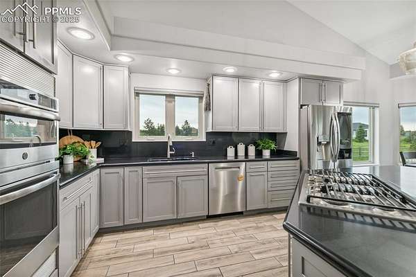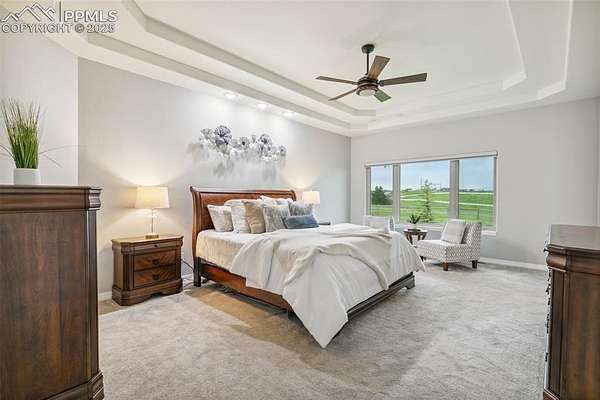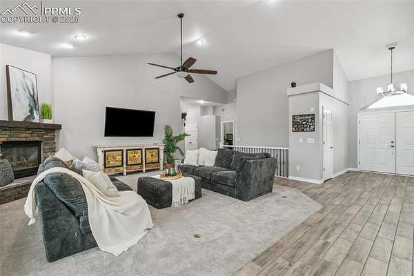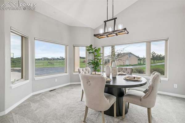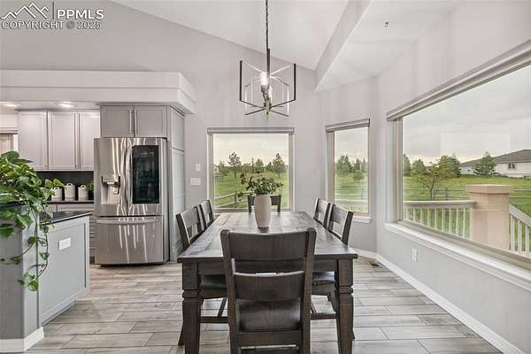 This exceptional Black Forest property features 7,392 sq ft across two distinct residences, connected by a garage, all situated on a 5-acre cul-de-sac lot with breathtaking views of Pikes Peak and the surrounding mountains. The main ranch-style home, 5,284 sq ft, features vaulted ceilings, beautiful flooring, and hand-troweled walls. Its fabulous great room boasts abundant natural light and incredible views. The dream kitchen includes Silestone counters, double ovens, a gas cooktop, maple cabinetry, an island, and a bay dining area with deck access. A formal dining room and a family room with a fireplace and views complete the main living areas. The main level also has two bedrooms, an office, and a laundry room. The sumptuous master bedroom features a double-tray ceiling, expansive views, and a spa-like 5-piece bath with a soaking tub, dual-headed shower, dual vanity, a lighted makeup area, and a grand walk-in closet. The full walk-out basement expands living space with a second master bedroom, a second laundry room, and a massive recreation room featuring a wet bar and French doors that open to the patio. Two more bedrooms with a Jack and Jill bath are also downstairs. The spacious basement family room has a wet bar with seating, dishwasher, sink, and beverage fridge. The second residence, a 2,108 sq ft two-story addition, is ideal for multi-generational living with private access. Its lower level features a recreation, gaming, and media room with a half bath and laundry facilities, while the upper level offers a large living space, a full kitchen, and two bedrooms. This property is a dream for equestrians and a delight for hobbyists. It features a heated, oversized 3-car garage and an exceptionally huge, insulated 30x50 RV garage with lofted storage, workbench, 50-amp power, and house-controlled heating. A 3-stall barn with electricity and a fenced yard is ideal for horses. Truly a must-see for luxurious, spacious, and versatile living with unparalleled views.