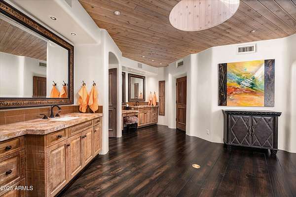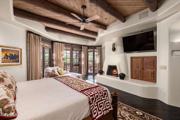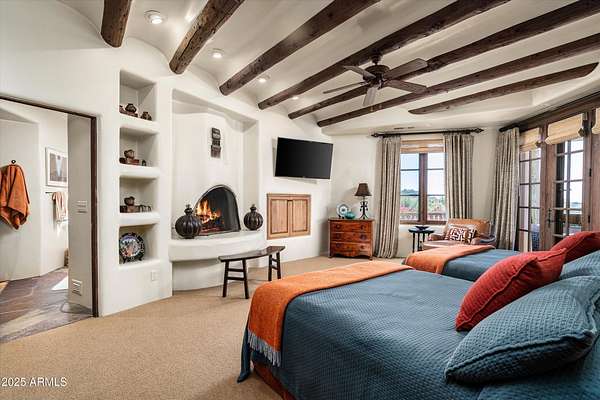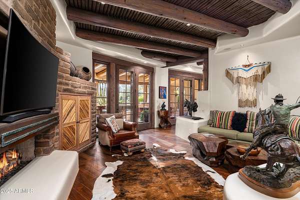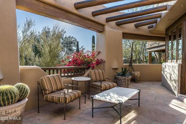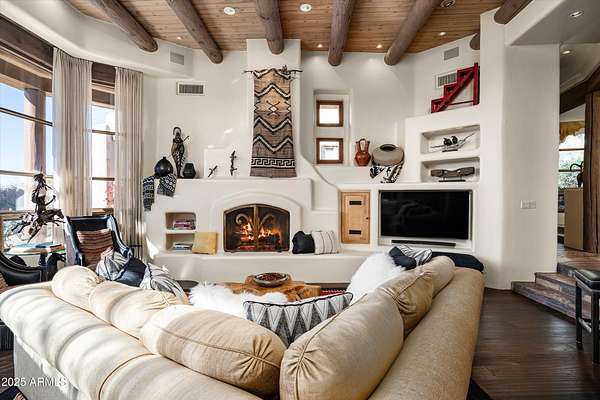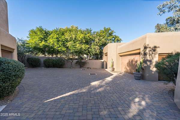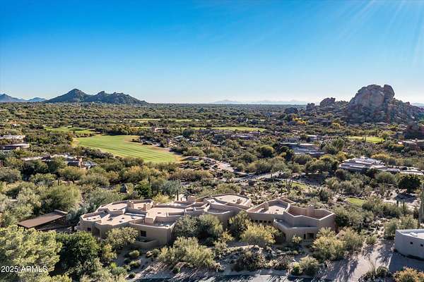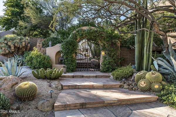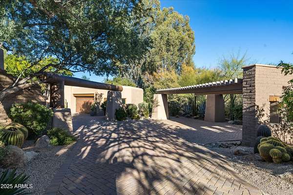 Tucked away in a serene and sequestered setting, meandering over a picturesque bridge, this enchanting Southwest estate captures the essence of Boulders living with timeless charm and natural elegance. Lee Hutchison designed this romantic 'organic pueblo', and it is a rare and special combination of timeless desert architecture meets luxurious living. Elevated lot offering expansive desert views stretching in every direction, a breathtaking backdrop to Black Mountain & the famous Boulder Pile. Crafted with warm natural materials, wood, stone, and adobe textures, the home blends beautifully into its surroundings. An elegant pool and spa area unfolds like a private resort, framed by a charming fireplace, the views are nothing less than iconic. The intimate guest wing provides ideal accommodations for visitors, with 2 spacious bedrooms, well-appointed en-suite bathrooms. Each quarter opens onto a secluded patio as well as having access to a shared living space with a wet bar for refreshments. True split floor plan beckons privacy with a primary suite awash in charm and amenities. Handsome office space completes the primary wing, with fireplace, one of 8 total on property. Doors open onto a wrap-around patio. One of a kind garage configuration that can accommodate 5 cars plus golf cart, adjacent to additional living spaces with en-suite bath - ideal for a studio, gym, office. Additional guest parking available under shaded pergola. N. Scott Momaday noted "The Southwest is a place of beginnings and endings, of stories written in sand and stone." What a treasure of an opportunity to write your Sonoran Desert story today.