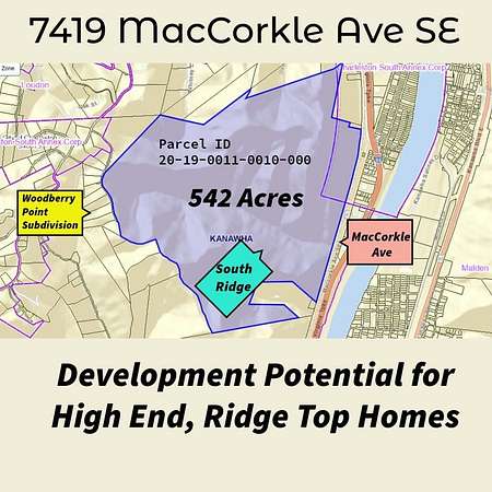 Outstanding investment opportunity in the heart of Kanawha County. This 542 acre contiguous tract offers significant potential for residential, commercial, or recreational development. Located just minutes from I-64, I-77, Yeager Airport (CRW), the University of Charleston, CAMC Hospital, and the Kanawha River, this site combines size, access, and visibility--making it ideal for investors and developers. Set along scenic ridgelines with sweeping views of the Kanawha Valley, the property lends itself to multiple development paths: luxury residential estates, a gated mountaintop community, ATV/off-road adventure park, timber, or commercial infrastructure. The varied topography also supports eco-tourism, conservation uses, and hunting leases. Utilities nearby and regional demand for housing and recreation make this a timely acquisition. Whether you're looking to subdivide, hold for appreciation, or create a destination development, this property checks all the boxes: scale, location, natural beauty, and strategic access. Opportunities of this magnitude in the Charleston metro area are rare. Don't miss your chance to invest in one of the most versatile and expansive land tracts in central West Virginia.