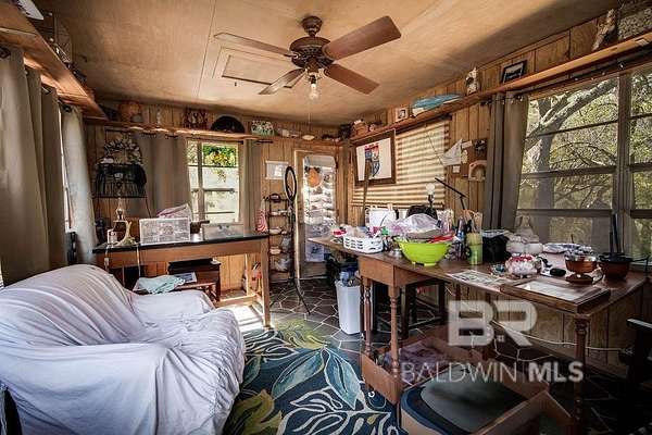 More than a HOME, it is your very own homestead that offers so many options. Home is built in 2022 and has fortified roof!! Do you want a custom built home that does not look like your neighbors house? THIS IS IT!!! With raised ceilings, recessed lighting, open floor plan. Kitchen boasts of solid wood custom cabinetry with pull out shelving, COMMERCIAL GAS COOKTOP with vent hood. Built in microwave and oven. Oversized island with breakfast bar and separate breakfast area. You will also enjoy the APPLIANCE GARAGE, FURNITURE STYLE LEGS AND STORAGE DRAWERS in kitchen. Designer lighting package, and recessed lighting. Even the ceiling fans are amazing in this home. Great room has so much space, you can have a grand piano, huge sectional and still have elbow room. French doors off great room leads to the most amazing and peaceful 16x16 COVERED DECK that will allow you to appreciate your abode. Primary bedroom with tray ceiling and ceiling fan with ensuite bathroom that has sitting area, OVERSIZED TILE SHOWER, walk in closet. LVP throughout, NO CARPET. 2 car GARAGE. Additional structures on property include a 16x12 ART ROOM that would be a perfect at home office, or potting shed (not included in square footage). 16x12 workshop, and a boat or RV cover. You can have chickens and a large garden, and make your very own homestead on this property and still enjoy convenience to the interstate, shopping and Saraland Schools. *AND there is an additional perc test on file if you have the need for a second dwelling on property. Plumbing manifold for convenience. Buyer to verify all information during due diligence.