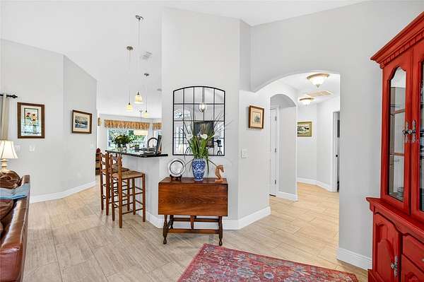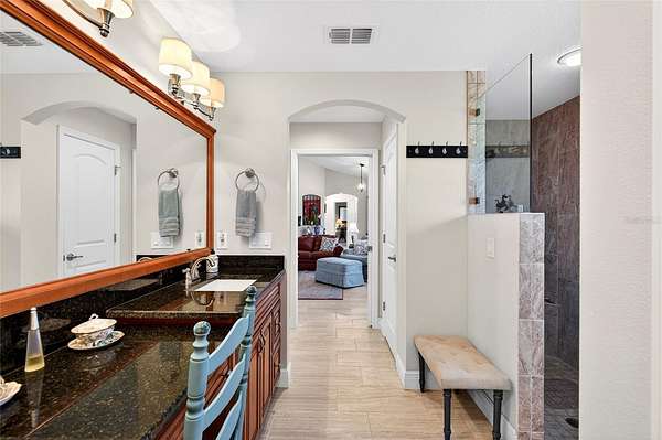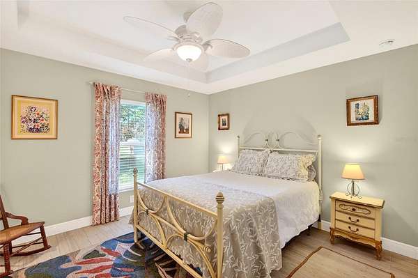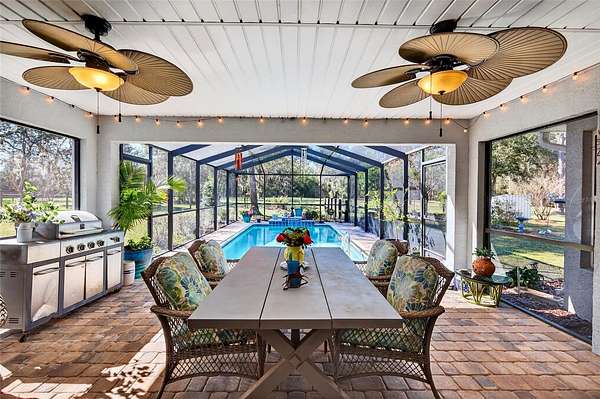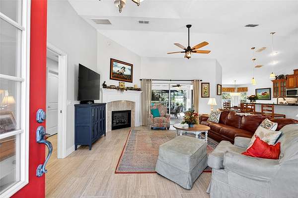 AS YOU APPROACH THE FRONT OF THE HOME YOU ARE GREETED WITH MANICURED LANDSCAPING LEADING TO COVERED FRONT PORCH, STEP INSIDE TO SPACIOUS OPEN FLOOR PLAN. SPACIOUS LIVING ROOM HAS GAS FIREPLACE, VAULTED CEILINGS AND INCREDIBLE VIEWS OF COVERED LANAI LEADING TO INGROUND, SOLAR HEATED POOL WITH SCREENED ENCLOSURE. AS YOU STEP BACK INTO SIDE HOME THE PRIMARY BEDROOM IS TO THE LEFT OFFERING A PRIVATE SPACE WITH VIEWS OF THE BACK PADDOCK. THERE IS A WALK IN CLOSET AND PRIMARY BATH WITH CUSTOM CABINETRY WITH DOUBLE GRANITE TOP VANITY, AND LARGE TILE SURROUND GLASS DOOR SHOWER WITH BUILT IN SEAT.