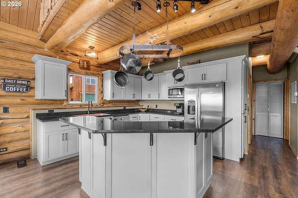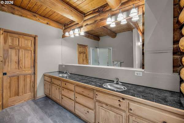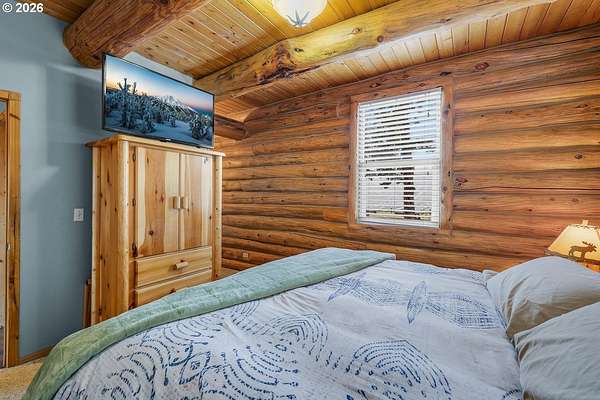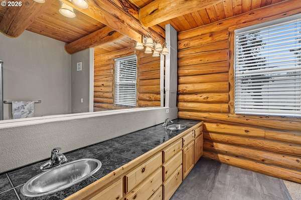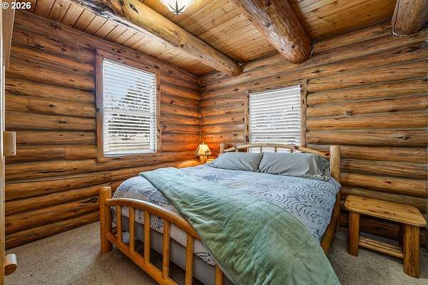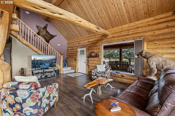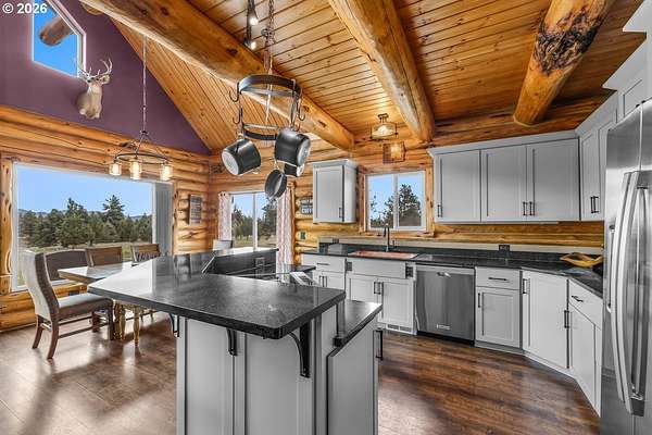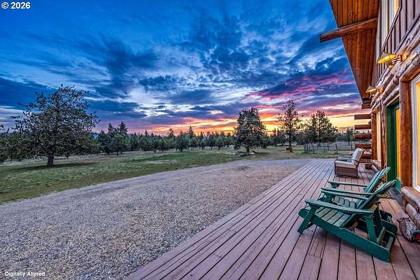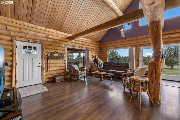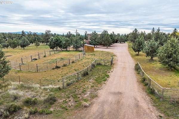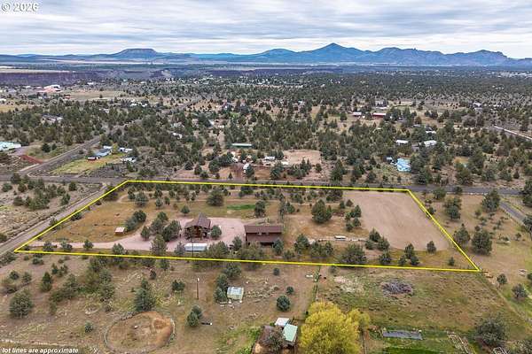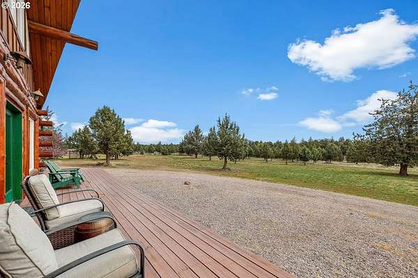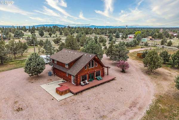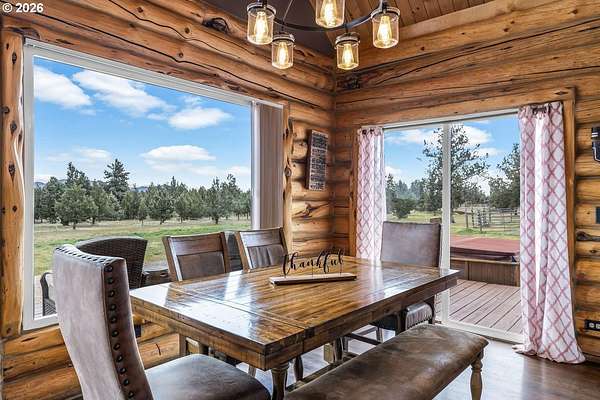 Wide open spaces & warmth throughout define this stunning hand-hewn log home, complete w/guest suite on 5 horse-friendly acres in the heart of Crooked River Ranch's high desert. Open floorplan w/vaulted ceilings & large picturesque windows flood the home w/natural light & sweeping views of the surrounding landscape. Kitchen boasts an abundance of cabinetry & prep space w/central island, dedicated eating area, granite counters & updated appliances. Main-level primary suite offers convenience & comfort w/double vanity & walk-in shower. Upstairs: 2 BDs, full BA & open loft area w/breathtaking sunrise views. Large deck perfect for entertaining year-round. Fully permitted 2 BD/1 BA guest suite w/living rm, 2 well-appointed bonus rms great for gym, hobbies or storage & its own septic system. Plenty of room for critters & toys: 2 stalls, tack rm, indoor hay storage, 2 runs, shelters, sanded arena & auto-heated waterers. Min to world-famous Smith Rock SP, Crooked River, trails & Redmond.