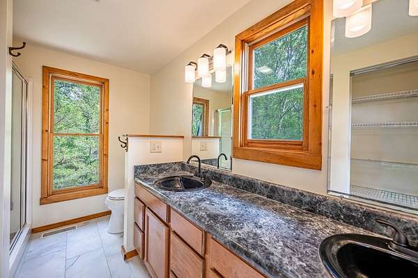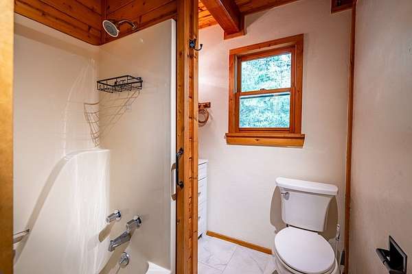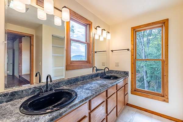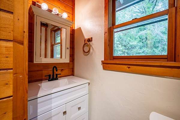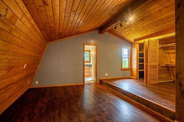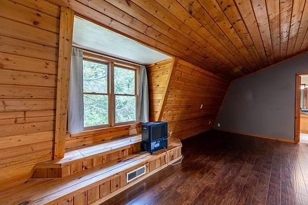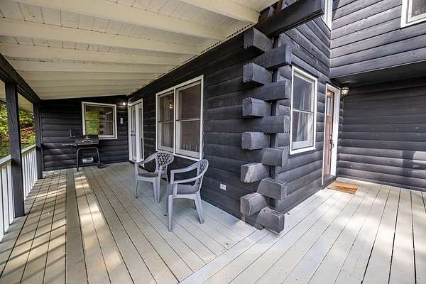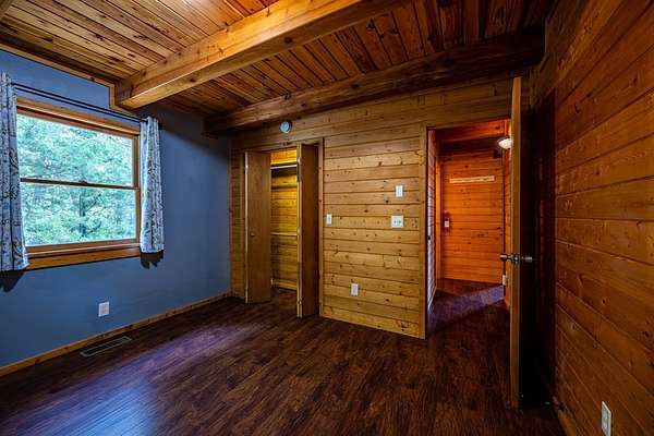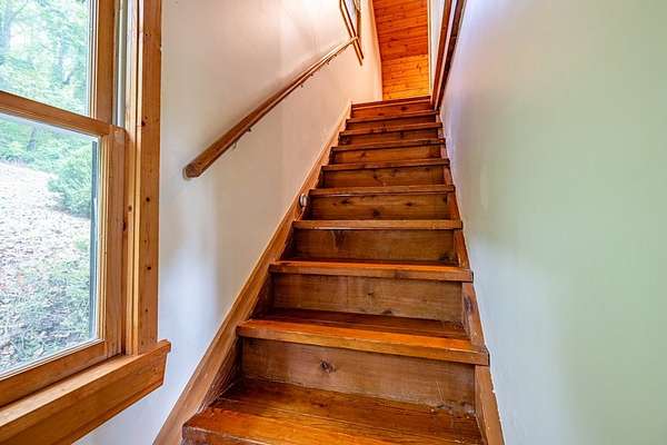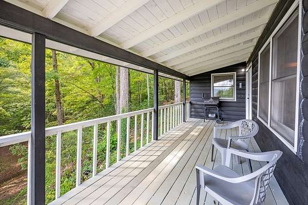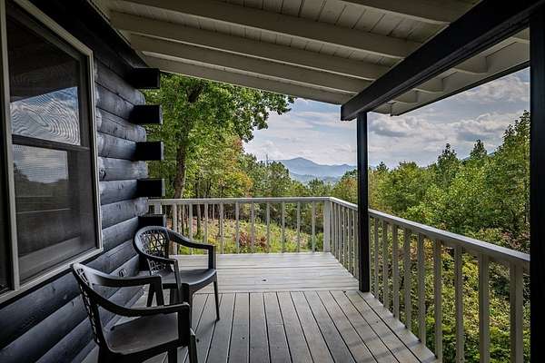 This handcrafted log home sits on 6.9 private acres at the top of a mountain, offering long-range views and quiet surroundings. Inside, the timber construction gives the home a solid, cabin-style feel. The main living area includes a gas-log fireplace, a small reading nook, and an efficient kitchen with stone counters and workable storage. The main level bedroom can function as a guest room, office, or flex space, with a full bath nearby. Upstairs, the primary suite has vaulted ceilings, good natural light, and windows that frame the surrounding Blue Ridge views. The layout keeps sleeping areas separate from the main living space for added privacy. Outside, there is a defined fire circle for gathering and established paths through the woods that lead to usable clearings, suitable for camping, play areas, or simple seating. The property has modern systems, including reliable heating, updated utilities, and current appliances, so it works as a full-time residence or a low-maintenance second home. Located near the North Carolina and Georgia line, the home offers easy access to local towns and trailheads while remaining private and quiet.