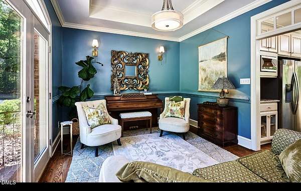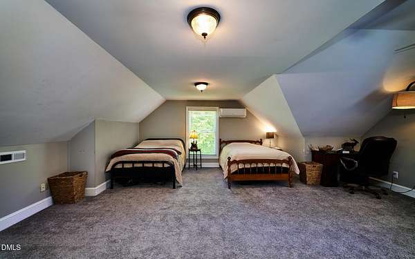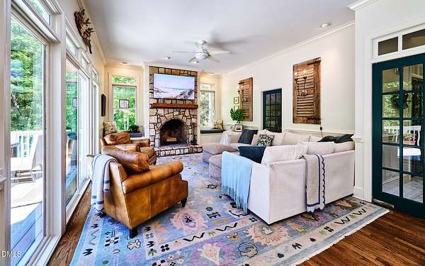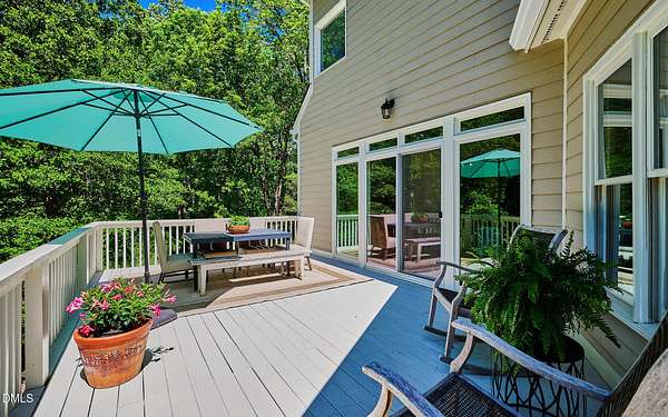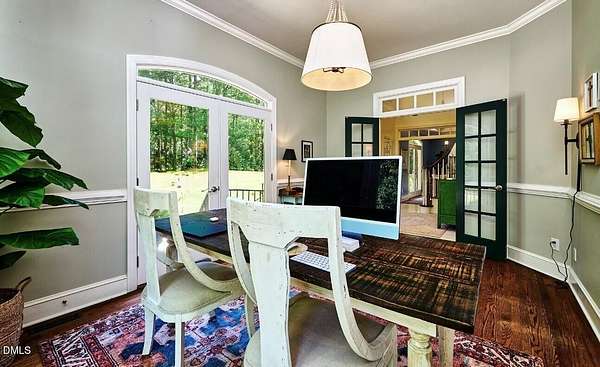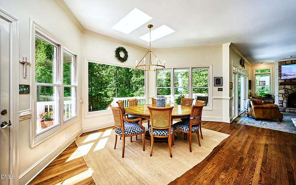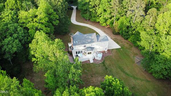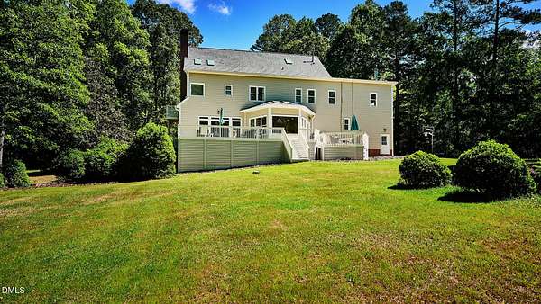 Stunning custom two-story home nestled on approximately 3 acres of breathtaking, private land in a highly desirable neighborhood--just minutes from North Raleigh, Falls Lake, and downtown Wake Forest. Enjoy a peaceful approach down an extended driveway that leads to this beautifully appointed home, with acreage backing to protected Army Corps of Engineers land for added privacy and natural views. Inside, the home features refinished hardwood floors throughout both the main and upper levels, along with abundant natural light. The spacious gourmet kitchen has been thoughtfully updated with custom cabinetry, a center island, stainless steel gas range, dual sinks, walk-in pantry, and a bright window-filled breakfast nook that brings the outdoors in--perfect for everyday living and entertaining. Formal dining and living rooms provide elegant gathering spaces, while a dedicated office adds flexibility for remote work. The cozy family room showcases a stunning masonry stone fireplace, and a secondary back staircase leads to a large bonus room with its own fireplace. The home offers four bedrooms, including a private third-floor teen or guest suite. The primary suite features a tray ceiling and private balcony--an ideal retreat to unwind--while the en-suite bath includes a cathedral ceiling, whirlpool tub, and skylights for a spa-like feel. Outdoor living is equally impressive, with an oversized deck, multiple balcony spaces, and serene wooded views. Additional features include a storage building and numerous upgrades throughout. This exceptional property offers the perfect blend of privacy, luxury, and convenience--truly a dream home!