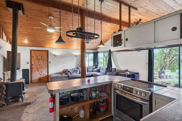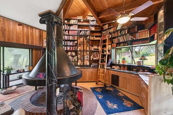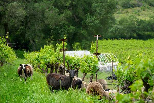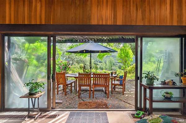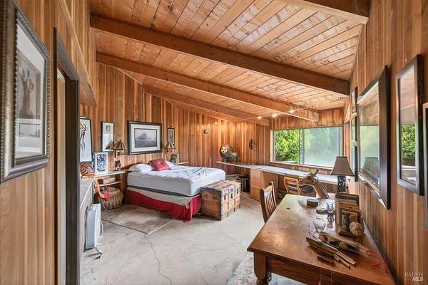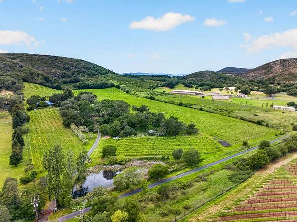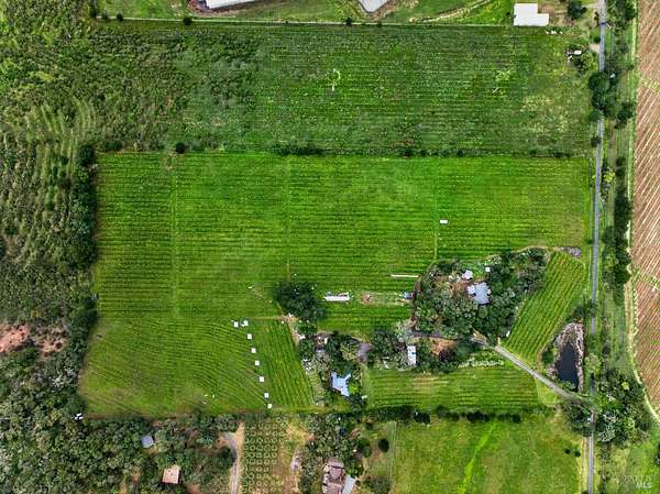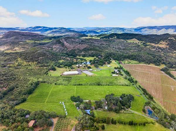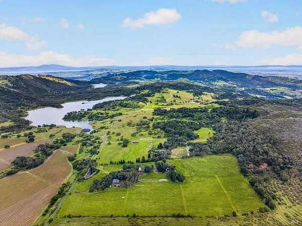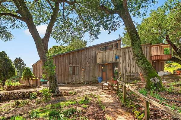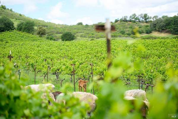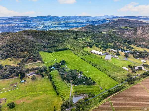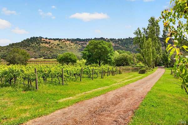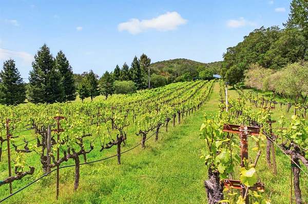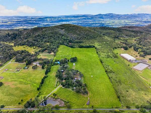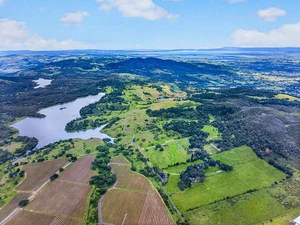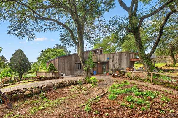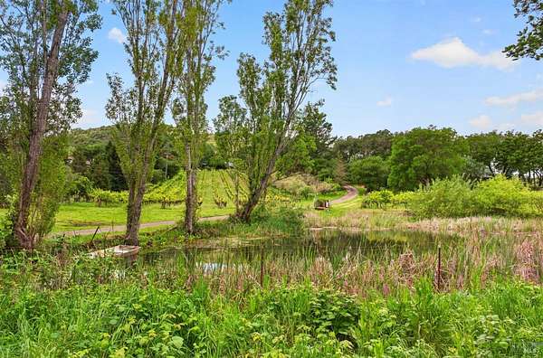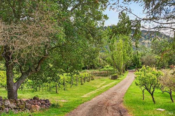 A property that lives like a story where mornings begin among the vines and evenings end under open skies this is Napa Valley living in perfect harmony. Just 15 minutes from the heart of downtown Napa, this ~20-acre vineyard estate offers a rare sense of escape without sacrificing convenience. Beyond the gated entry, a year-round pond and gently winding drive introduce a landscape of rolling hills, vineyard rows, and open pasture where grazing sheep and seasonal greenery create a quintessential wine country setting. Approximately 17 acres are planted to Chardonnay and Pinot Noir, offering both visual beauty and income potential. At the center of the property, the ~2,002 sq ft main residence reflects rustic modern design inspired by Frank Lloyd Wright, with angular rooflines, natural wood siding, and a warm, inviting great room. Vaulted ceilings, wood-paneled walls, built-in shelving, and a freestanding mid-century modern wood-burning fireplace define the space, while expansive windows invite in natural light and frame vineyard views from nearly every room. Tucked away in its own private setting, a seperate 2-bedroom, 2-bath guest cottage offers a serene retreat with refined rustic elegance featuring soaring wood-paneled ceilings, abundant light, peaceful garden and vineyard views. This elegant vineyard estate is defined by beauty, balance and a deep connection to the surrounding landscape.