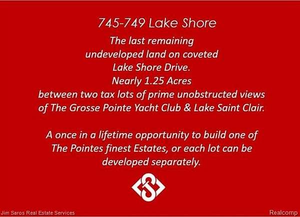 The last opportunity to acquire the only undeveloped land on coveted Lake Shore Drive! Nearly 1.25 acres between 2 tax lots with 202 feet of Lake Shore frontage and a lot depth of approximately 222' ft deep. Neighboring The Grosse Pointe Yacht Club with prime unobstructed view of Lake St Clair, 745-749 Lake Shore can be developed into one of The Pointes finest Lake Shore estates, or each parcel has the potential to be developed individually. A blank canvas to build your dream home. Offered at an attractive price point for a lot of this size and location. Inquire for additional details!