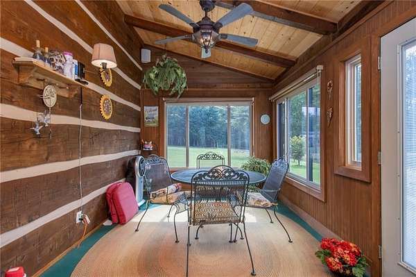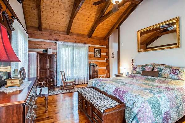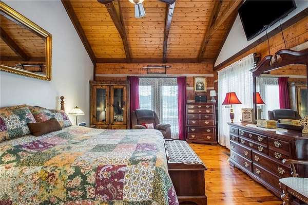 Private lakeside living at its finest. Set on 5.33 secluded acres along a tranquil 12-acre private lake, this custom log home blends timeless craftsmanship with rustic sophistication. Dramatic cathedral and beamed ceilings, a grand bay window with sweeping lake views, and a stone-accented gas fireplace define the open great room.