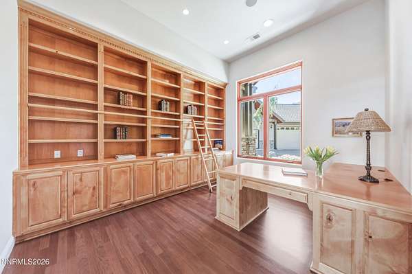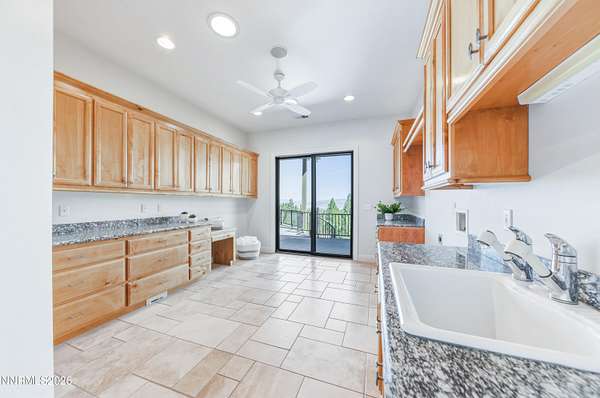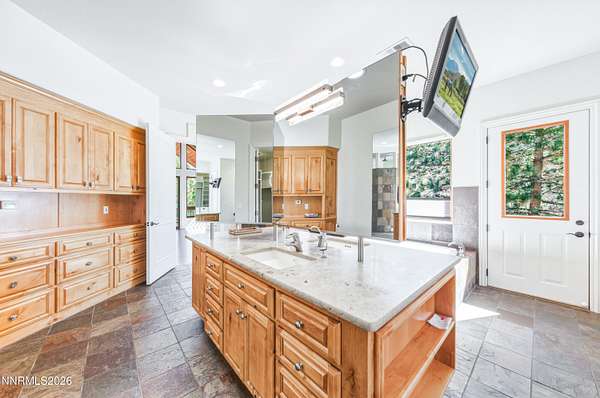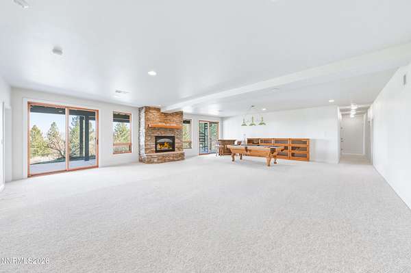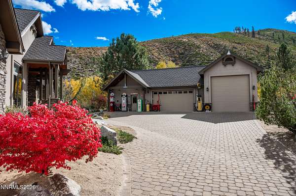 Renewed, refreshed, and ready to move in-this exceptional Washoe Valley property is defined by its setting and sweeping views across the valley and Washoe Lake. Situated on five acres at the south end of the valley, the property offers a rare sense of openness and privacy, with convenient access to Carson City and just minutes from Toiyabe Golf Club. A stand of old growth aspens borders the eastern edge, where a year-round creek creates a serene natural backdrop. Tucked within the trees, a Quonset hut offers additional, discreet storage. Inside, natural materials and thoughtful updates define the mountain modern home, including knotty alder cabinetry, travertine and slate flooring, and newly refinished Brazilian cherry hardwood with a modern finish. The kitchen has been updated with new granite and is well-equipped with a Sub-Zero refrigerator and freezer, six-burner gas range with pot filler, and three dishwashers-designed for both daily living and larger-scale entertaining. Three gas fireplaces add warmth and ambiance throughout. The home is designed for comfort and efficiency with natural gas forced air heat, electronic air cleaners, two upstairs air conditioning units, two 75-gallon water heaters, and a backup generator. The lower level is accessible by elevator and offers flexible living for guests, in-laws, or live-in assistance, with a spacious guest suite, additional bedroom, kitchenette, game room, and a versatile bonus space or fifth bedroom. An oversized attached two-car garage includes a dog wash station. The detached garage expands the property's versatility with heated bays, an office or living space with full bath and tankless water heater, a workshop with pass-through doors, and a second bay accommodating a 43-foot RV-also with pass-through access. Enjoy the mountain, valley and lake views from every room and the spacious covered deck!