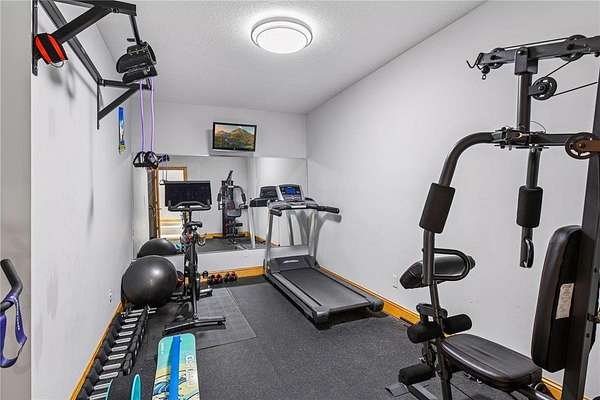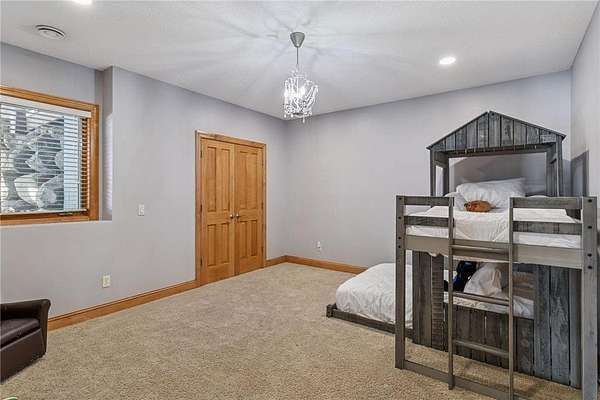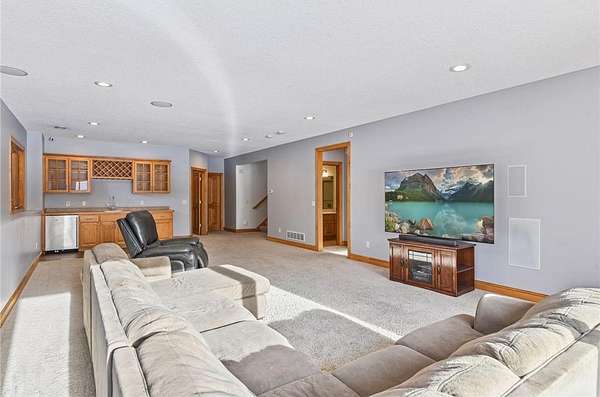 The kitchen is thoughtfully appointed with granite countertops, stainless steel appliances, under-cabinet lighting, and modern tile backsplash. The walkout lower level expands the living space with two additional bedrooms, a large family room with a second gas fireplace, a convenient wet bar, and a dedicated exercise room or flexible bonus space.