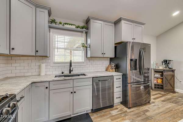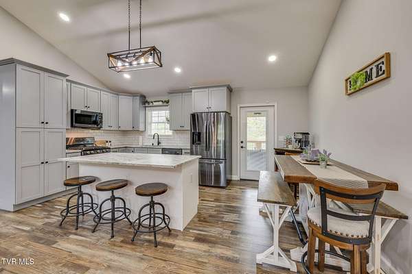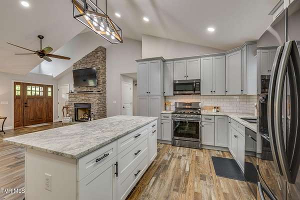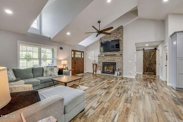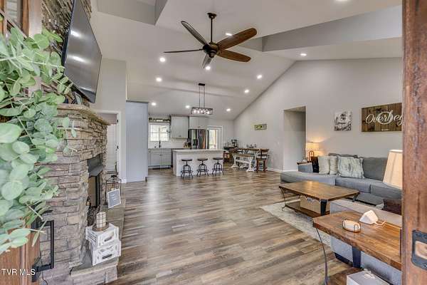 This well-maintained home, built in 2021, offers 4 bedrooms, 3 full bathrooms, and sits on just over 2 acres with mountain views. The property features a creek along the rear boundary, a natural spring, a large fire pit area by the creek, and a fence in back yard! Inside, the main level includes a spacious living room with a gas fireplace and an open kitchen equipped with a gas range, stainless steel appliances, leathered granite countertops, and soft-close cabinets. The primary suite offers a large closet and an en-suite bathroom with a tiled walk-in shower. Two additional bedrooms, a full bathroom, and a laundry area are also located on the main level, providing a well-designed floor plan. The home includes a two-car garage on the main level with an 8x10 garage door. The lower level features a fourth bedroom or flexible den space with a private full bathroom, along with an additional two-car garage. Outdoor living includes both a covered front porch and a covered back porch overlooking the landscaped yard. The property has been maintained with attention to detail, including stone landscaping sourced from the property itself. Additional features include gas heat, a gas water heater, and a hookup for a gas dryer. Schedule all showings through ShowingTime. All information taken from third-party sources and tax records. Square footage is approximate. Information is deemed reliable but is the sole responsibility of the buyer to verify.