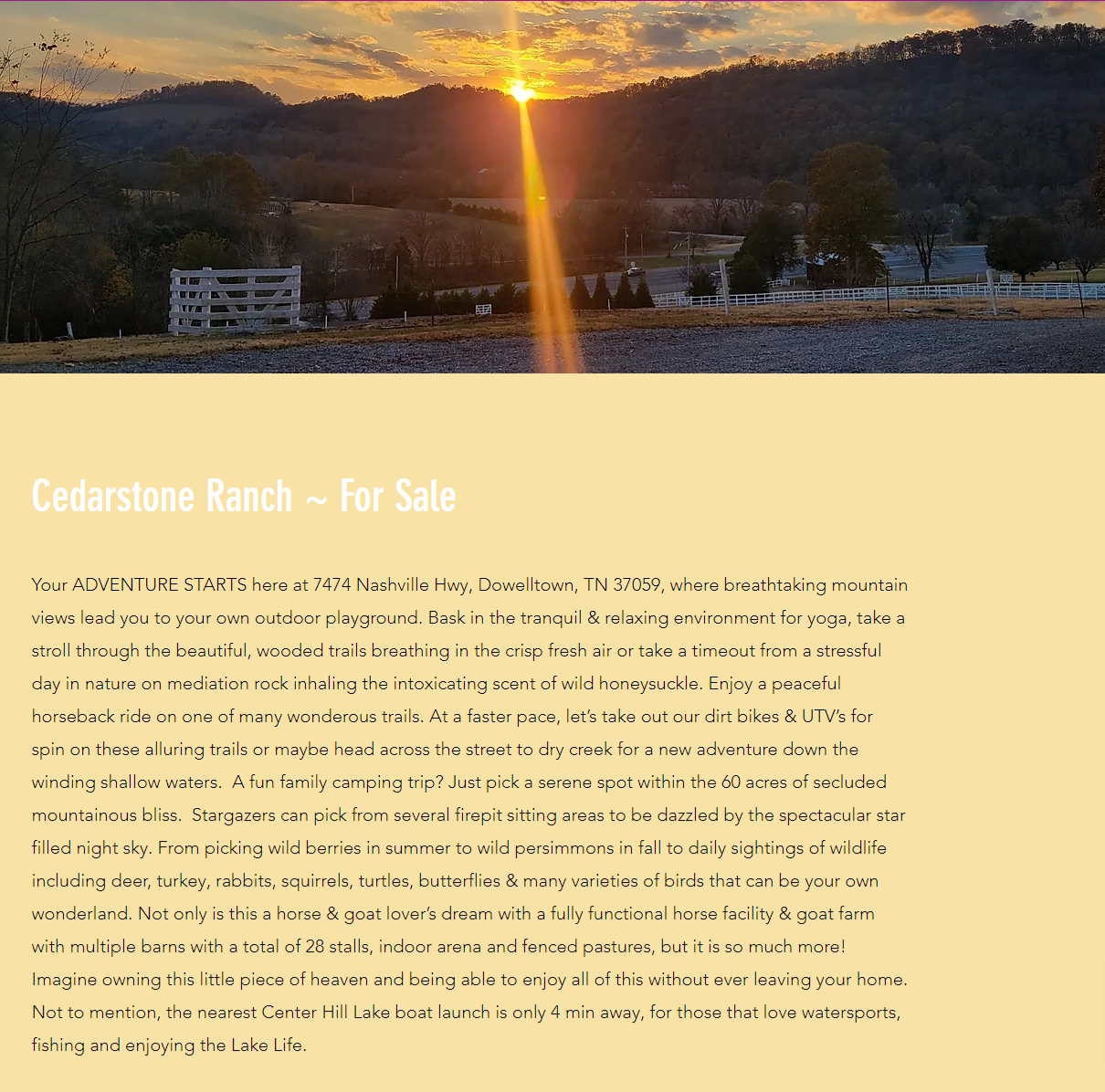 Horse Lovers Dream and Private Mountain Retreat! Fabulous secluded location nestled in the hills of Tennessee. Custom built 2000 sq ft designer brick home with stunning mountain views and 5 min from Center Hill Lake & 45 min from Nashville Airport. 60.3 acre functioning horse and goat farm. Automatic gated entry and lighted paved drive. 4 bedrooms and 2 bathrooms, master suite with double vanity and walk-in closet, office/5th bedroom and laundry room with Whirlpool front load washer/dryer on pedestals. All bedrooms have hardwood flooring as well as hallway, dining room and living room. No carpet! Oversized double pane windows throughout. Marble top kitchen island and solid oak cabinets with lots of cabinets and counter space as well as under cabinet lighting. All appliances included. Master suite and living room are insulated under the house. Gas fireplace with blower by Majestic. All new updated light fixtures and faucets. House security system and landscape lighting. Spacious porch overlooking pastures, large fenced front yard and gorgeous mountain views. 3 fire pit sitting areas. Several pastures with freshly painted fencing, 42 x 40 matted 6 stall lower barn with fans and a 10 x 12 shavings bin storage, 30.5 x 12 enclosed hay barn, 20.5 x 21 livestock barn with gates, 15 x 27 pasture shelter, 16.5 x 10.5 garden storage shed, 30x10 dog kennel with canopy, 36 x 30 four car garage/shop with connected 36 x 15 carport for trailer and 220 electricity, 22 stall upper barn 110 x 92 with open pasture, lighted indoor arena 80 x 50 with skylights and stereo speakers, wash rack with hot water, bathroom, tack room, automatic waterers, hay storage, 10 x 12 shavings bin storage, rain water storage. Small concrete and block tornado shelter. Small fish pond and rock waterfall surrounded my Japanese maple trees. Lots of wildlife; deer, wild turkeys, rabbits, squirrels, turtles and many varieties of birds. Wild onions, honeysuckle, persimmon and black walnut trees on the property. Walking, UTV and horse riding trails throughout property in the wooded area. Beautiful clear night views of the stars! No HOA! In 5 minutes from the house, you can be launching your boat or jet ski on to Central Hill Lake. Close to many marinas with waterfront dining. 10 min from Smithville, 45 min from Nashville Airport, 35 min to Cookeville, Murfreesboro, McMinnville or Lebanon. One of the cheapest counties to live in Tennessee. The income/business opportunities with this unique property are endless. You can make this a beautiful glamping site or wellness retreat, conduct events/venues, provide boarding/training facility, offer trailing riding or hiking to name a few. Option to have Nigerian Dwarf goat herd and Miniature horse herd with supplies included for additional cost. Please contact for more info, pictures, videos or to schedule a private viewing.