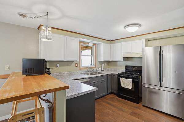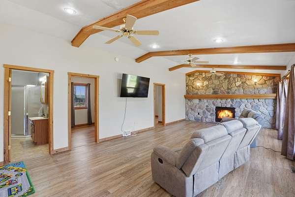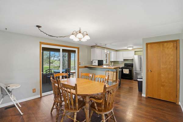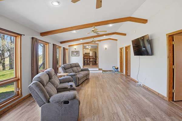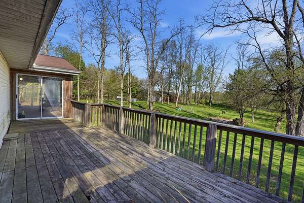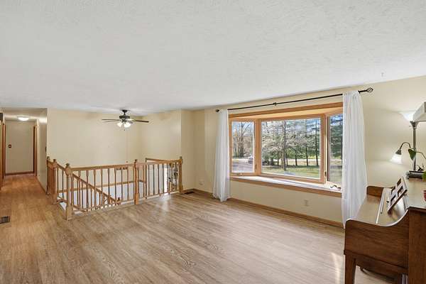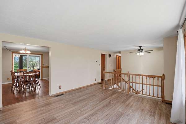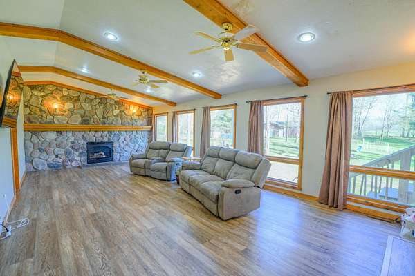 Welcome to this spacious 5-bedroom, 3 full bathroom home situated on just under 2 acres in Bellevue. This property offers multiple living areas, including a main living room featuring a rock wall fireplace and large windows that provide natural light and views of the backyard. Additional living space includes a family room with a bay window overlooking the front yard. The home also features large three-season rooms on both the upper and lower levels, offering additional space for a variety of uses. The property includes a 30x40 pole barn, offering versatile space for storage, equipment, or hobbies, along with acreage suitable for outdoor activities and other uses.