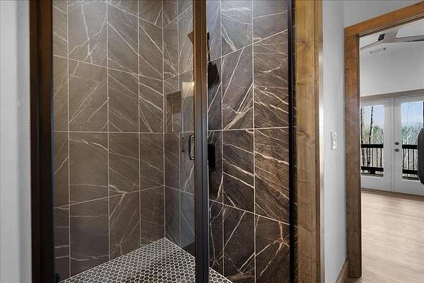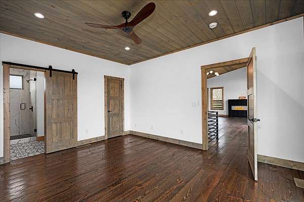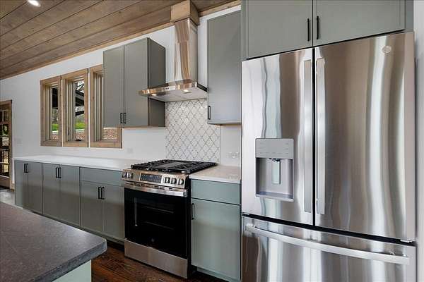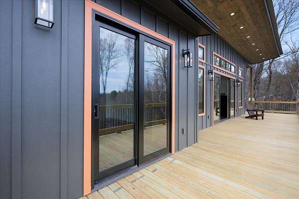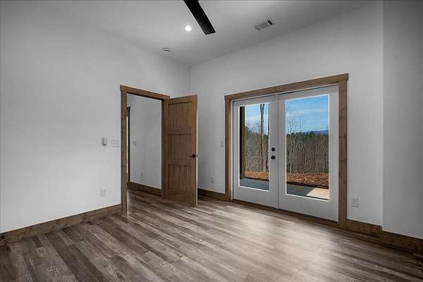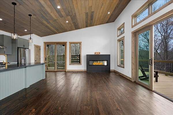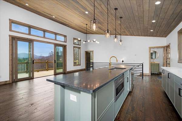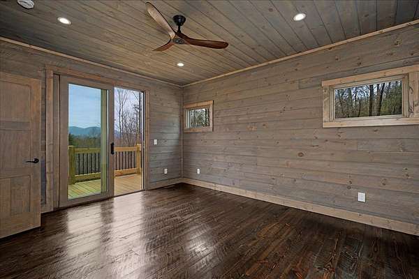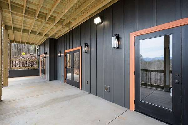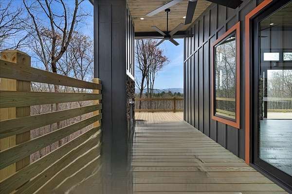 Entering the front door you immediately have a180 breathtaking view of the Rich Mountain chain in North Georgia with some of the highest peaks in Georgia at over 4000 feet in elevation. Facing east, you have unbelievable sunrises in the morning shade on the large expansive deck in the afternoons and evenings. There's a covered porch off the kitchen, sporting a gas log fireplace and privacy while still hosting enhanced views the of the mountains. The interior of the home has large open spaces with vaulted ceilings with exposed wood appointments of the ceiling and walls with native white pine paneling from the local sawmills in the area. The floors upstairs are also rough- sawn yellow pine, including the stairs leading to the basement. On the main floor, a very open great room where the dining, living and kitchen combine for panoramic views of the Rich Mountain chain. A wall of floor to ceiling, doors and windows, reaching nearly 14 feet in height feature converging 8 feet tall by 12 feet wide, sliding wood doors opening to the deck. Primary bedroom with en suite bath and double vanities are on main level. Downstairs a spacious gathering area with convenient mini kitchen and outside exits to the covered patio and walkway to a cozy fire pit. Two additional bedrooms are located downstairs each with en suite baths. The exterior is composite, Hardie siding, cement vertical siding with board and batten, trim and appointments. Maintenance free and long lasting. No trouble of carpenter bees on this stuff. The landscaping is complete with plenty of natural ground coverings to add to the rustic charm of the property. Property has 2.16 acres of land and the bottom of the property there's a natural spring. This home is cozy and stylish without being pretentious. Located only about 3 miles from the downtown Ellijay Square. An easy drive down Flat Branch Road from the property is the Ellijay mushroom farm and Roo Mountain Vineyards. The perfect mountain getaway