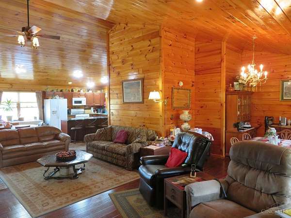 This eye-catching Mennonite-built log home offers 3-5 bedrooms and 3.5 baths. The great room features exposed logs, knotty pine walls, a cathedral ceiling, and a cozy gas fireplace with a tile hearth. The kitchen is equipped with modern appliances, a prep island/bar, and ceramic tile. A full poured wall walkout basement includes a finished bedroom and bath, providing extra living space. Outside, enjoy a 2-car attached garage w/a blacktop driveway offering ample parking, a covered front porch, and a private deck with breathtaking 12-mile views of Fort Hill Nature Preserve. A diverse set of barns and outbuildings, including a concrete block gambrel roof dairy barn with a loft, add to the property's charm. The gardener will enjoy a peach tree and berry orchard! All these amenities on a generous 15 acres, with additional land available. Call for more details!