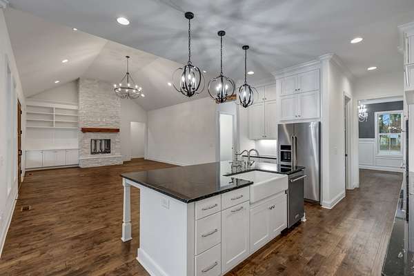 Inside, the heart of the home is a custom-built kitchen showcasing quartz countertops, double ovens, a large center island. The open living and dining areas feature luxury vinyl plank flooring and flow seamlessly to the covered back porch with a wood-burning fireplace, creating the perfect indoor-outdoor retreat.