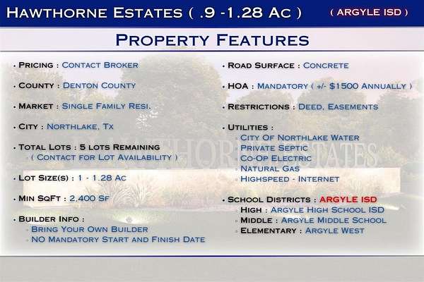 Discover the perfect blend of tranquility and convenience at Hawthorne Estates, Located at 880 Faught Rd, brand-new community nestled in the heart of Northlake, Texas. With 27 spacious lots ranging from .9 to 1.27 acres, this haven offers a peaceful and scenic retreat for homeowners.
