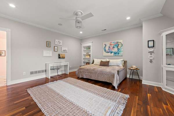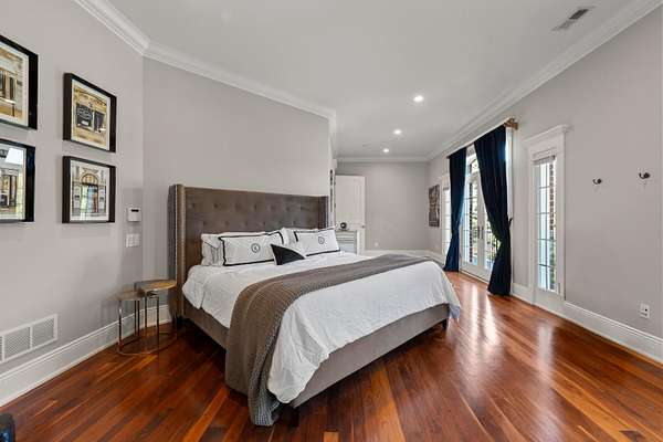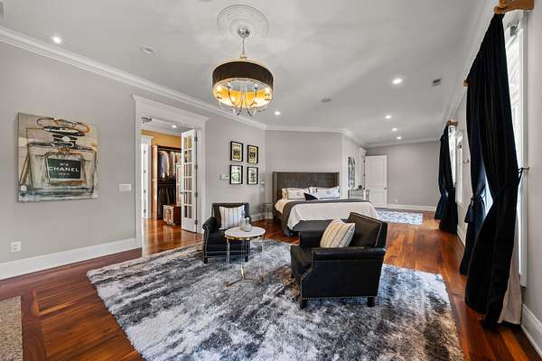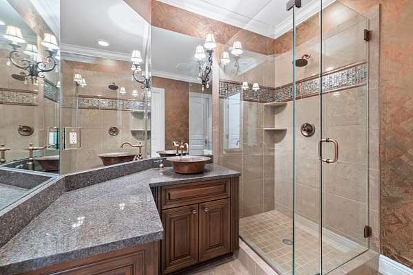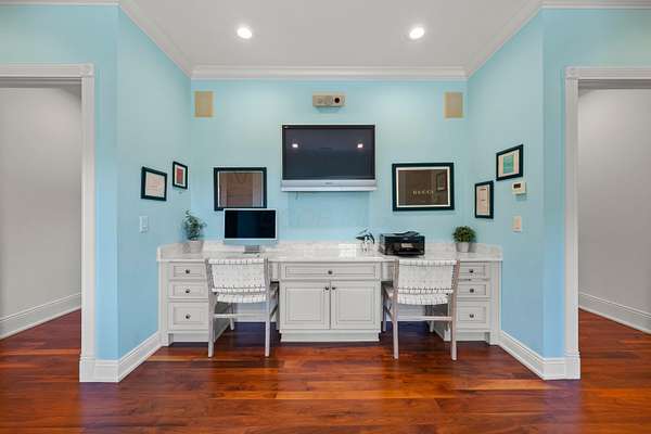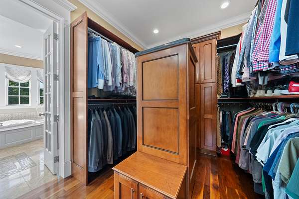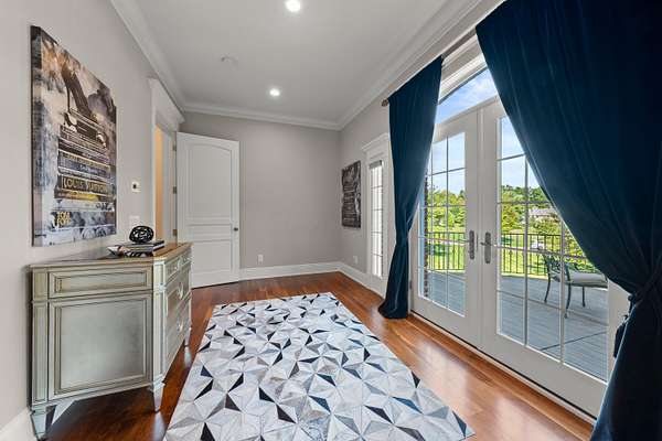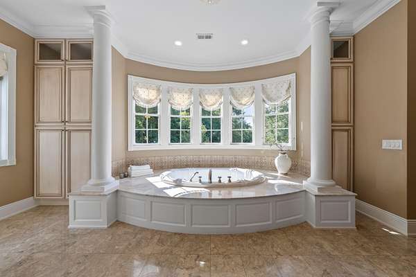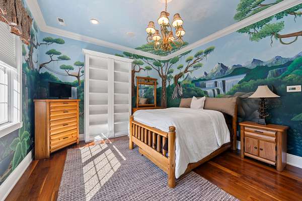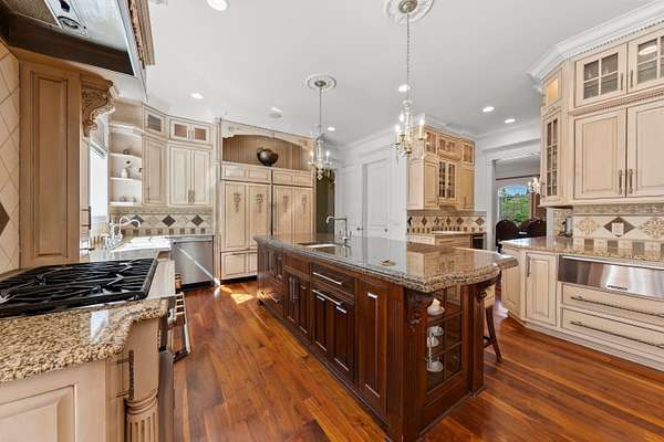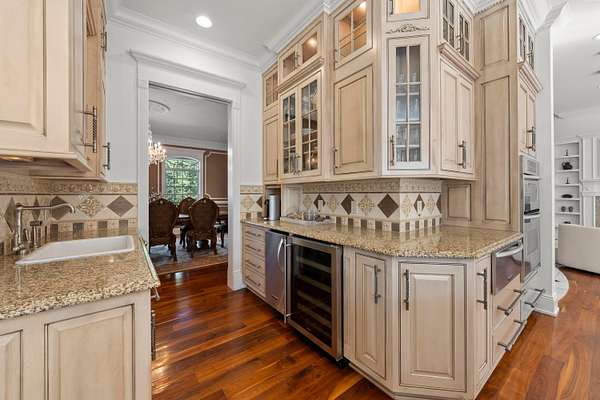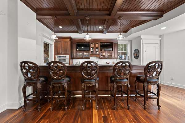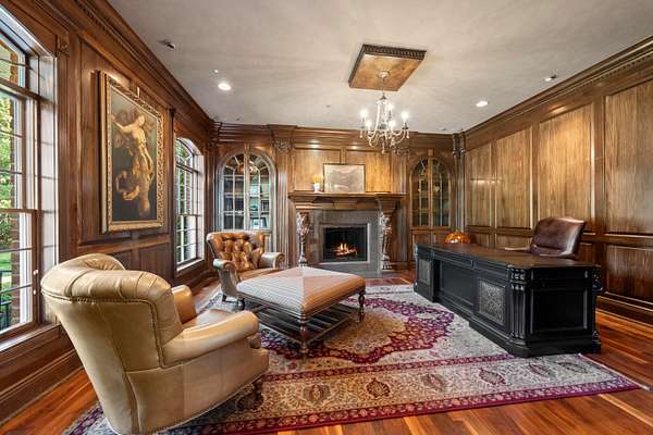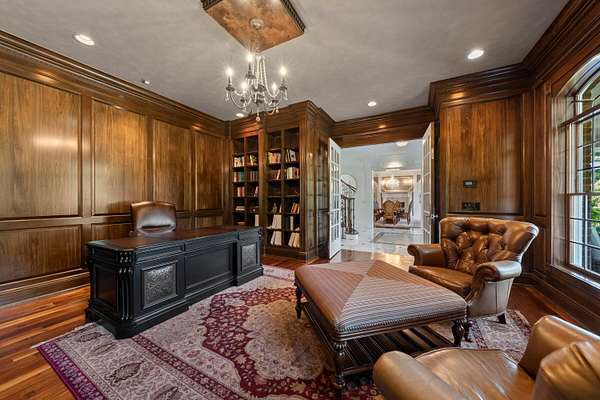 Additional notable features include a private walk-out balcony off the owner's suite, a personal movie theater, a richly appointed home office with ornate wood detailing, a temperature-controlled home office with ornate wood detailing, and an elegantly carved six-person bar designed for entertaining.