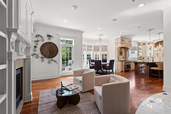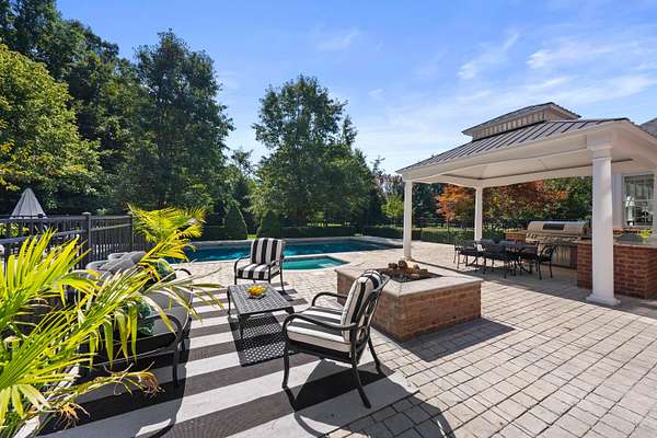 The outdoor spaces are equally exceptional. A large smart salt water swimming pool is complemented by a built-in grill and bar area on the pool deck, plus a hot tub, creating the perfect setting for entertaining or family enjoyment. Mature landscaping enhances privacy and highlights this private lot.