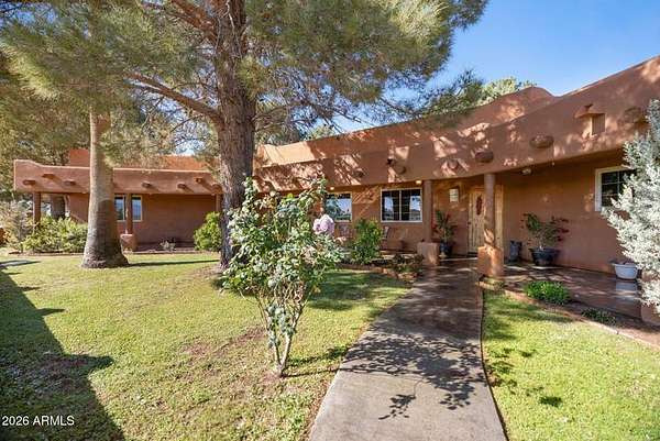 This Santa Fe–style home greets you with a covered front patio overlooking the mountains, the perfect spot to enjoy your morning coffee as the sun rises over open skies and quiet desert beauty.