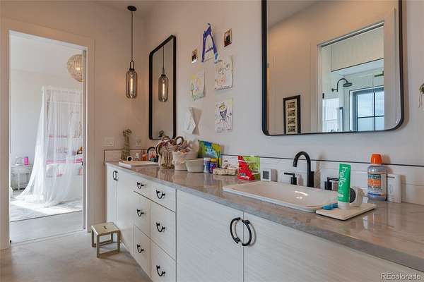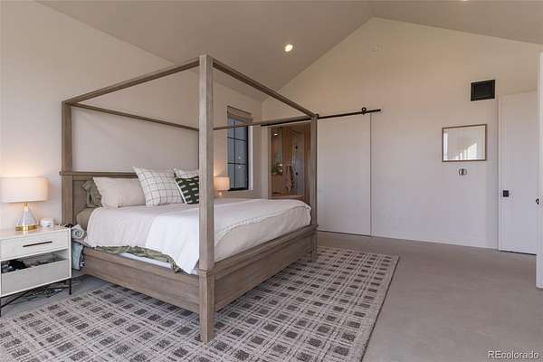 Interior finishes include honed concrete floors, custom maple built-ins, natural stone surfaces, and a full JennAir appliance suite. The private owner’s retreat features vaulted ceilings and a spa-inspired bath with a zero-threshold dual shower. Smart home integration provides control of lighting, shades, pool, and security.