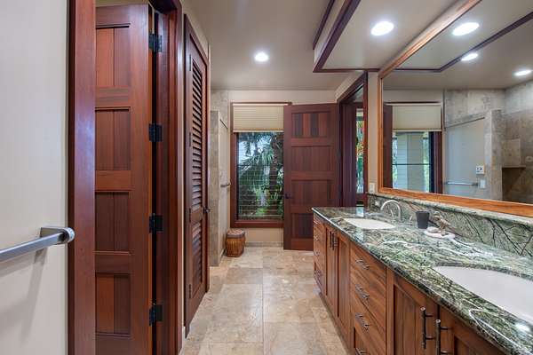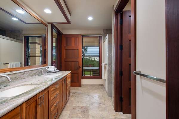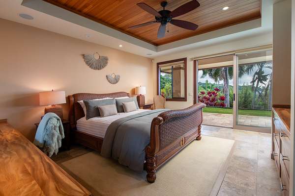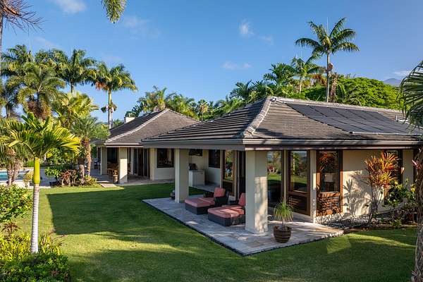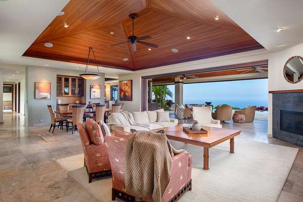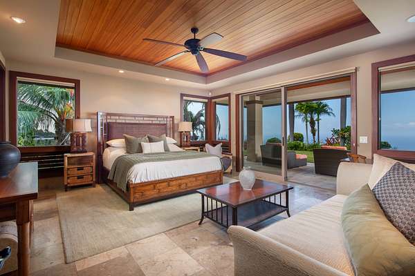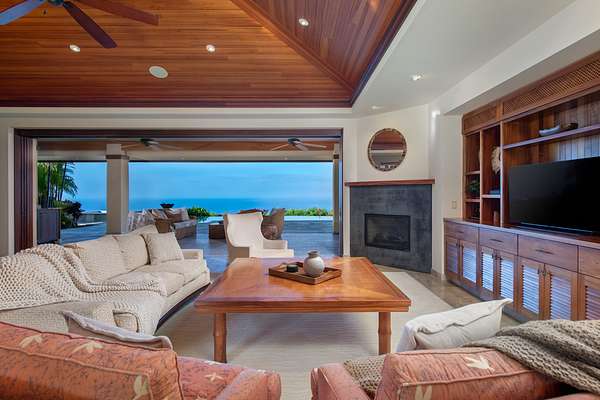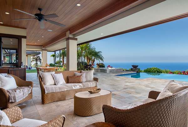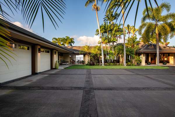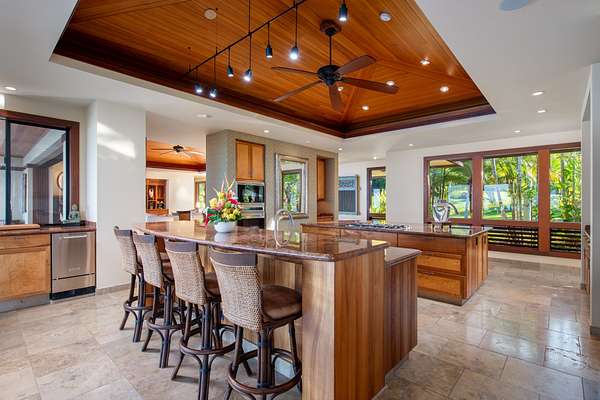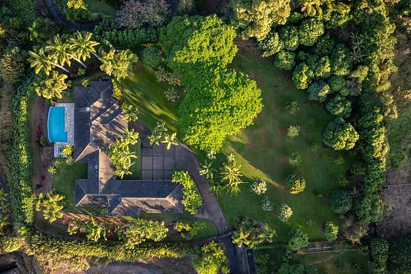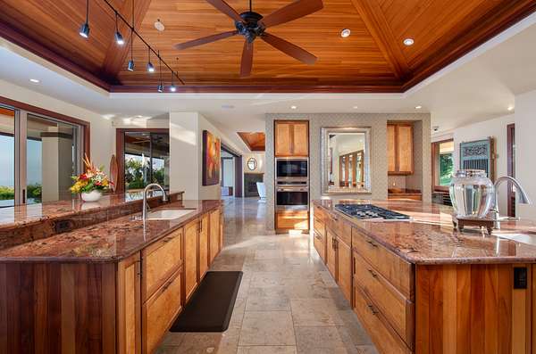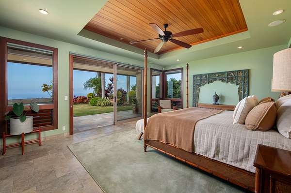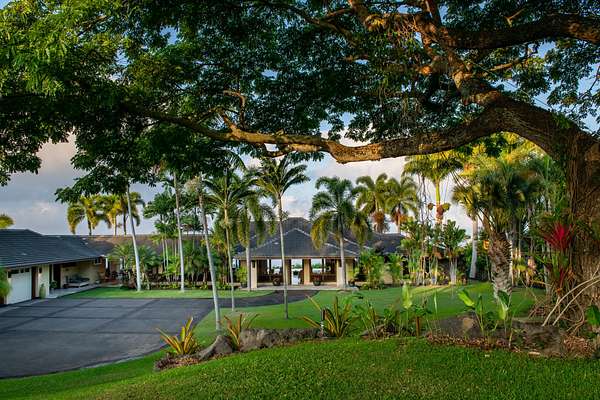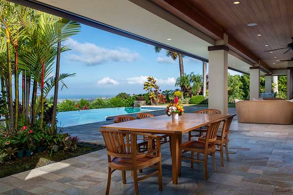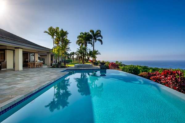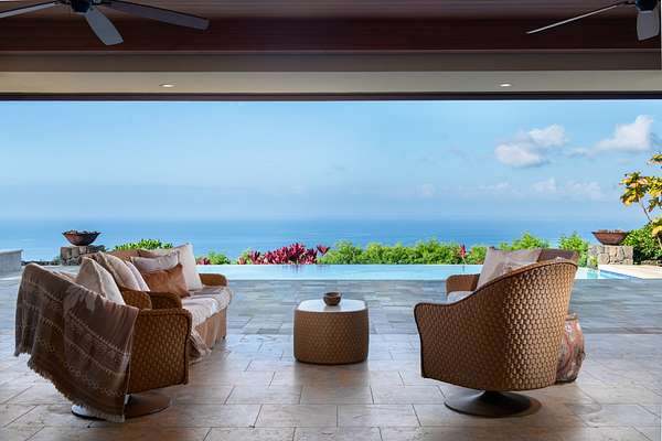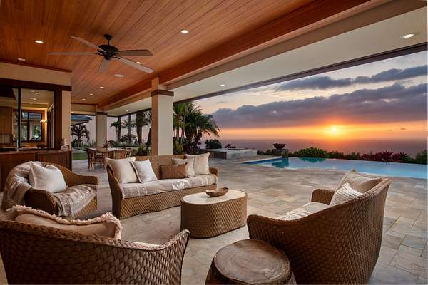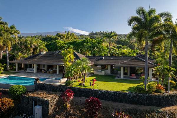 An exceptional offering in Pu Hoaloha, this magnificent estate presents a union of refined craftsmanship, serene acreage, and sweeping coastal vistas. Thoughtfully designed for a relaxed yet sophisticated island lifestyle, the residence showcases exquisite woodwork crafted from locally inspired and premium materials. These warm, organic finishes lend a sense of authenticity, artistry, and enduring quality to the space. Expansive great-room living unfolds seamlessly to covered lanais, manicured grounds, and a resort-style infinity pool. Multiple outdoor living areas invite open-air dining, quiet lounging, and evenings spent savoring Kona's legendary sunsets and ocean views. The single-level floor plan features three generously proportioned bedroom suites, with two guest suites thoughtfully set apart from the main residence for enhanced privacy, each offering a well-appointed bath. Every element has been carefully considered to support comfort, privacy, and effortless daily living. The kitchen serves as both a functional centerpiece and a work of art. Extensive burl maple cabinetry, trimmed in koa, is custom-built by master woodworker Ray Lambrecht. Entertainment centers, doors, and architectural trim sourced from local loggers are executed with exceptional precision, complemented by thoughtful storage and a layout ideal for both intimate gatherings and larger celebrations. Located on approximately 2.5 acres of gently contoured, serene land, the estate features sweeping lawns, mature tropical landscaping, and abundant producing fruit trees in a private, nature-surrounded setting.