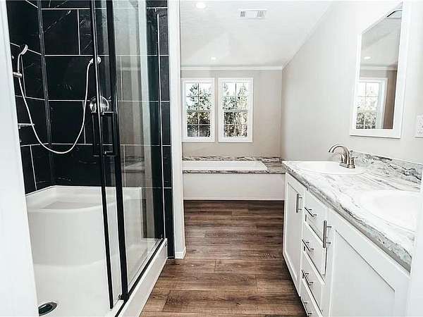 - Large bedrooms with comfortable space to spread out upgraded primary suite including separate tile shower and soaking tub.