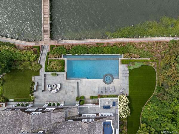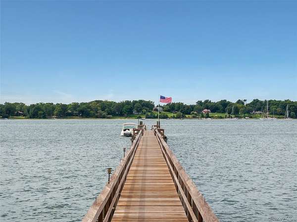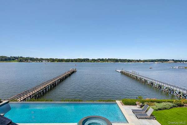 At the water's edge, a private 300+ ft deep-water dock (rebuilt in 2010) provides rare direct access for boating and yachting, anchoring the property as one of the most desirable on the North Shore. Expansive bluestone patios, manicured grounds, a covered patio, and a resort-style infinity-edge pool with spa capture breathtaking sunsets that paint the bay in spectacular color each evening.