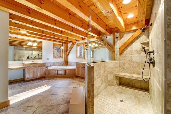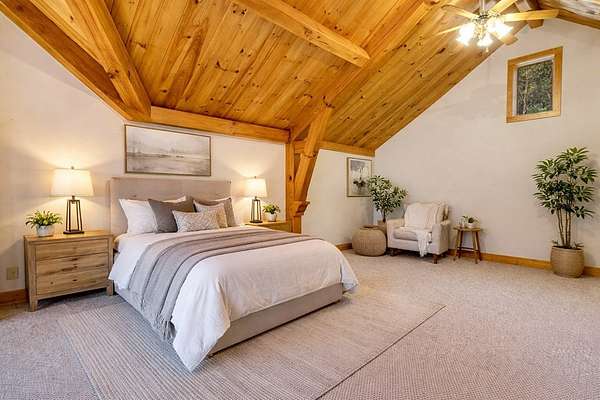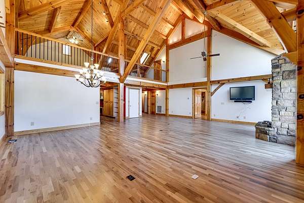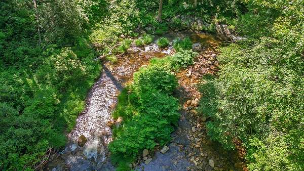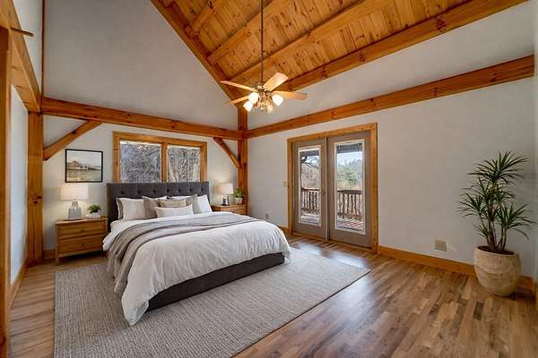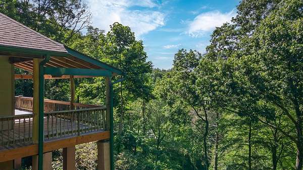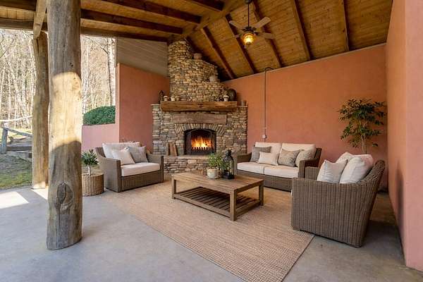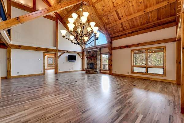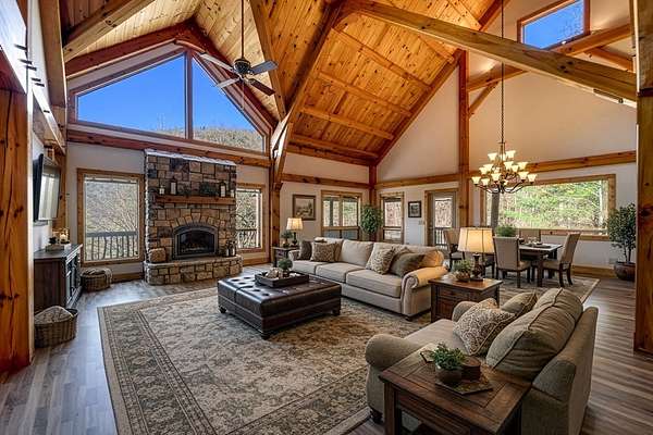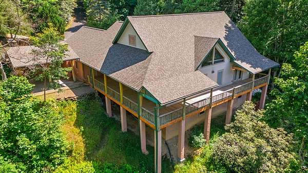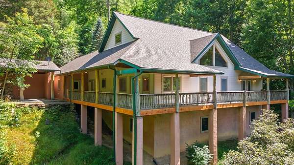 Tucked away on over 4 unrestricted acres, this private mountain retreat is enveloped by the soothing sounds of cascading waterfalls, creating a setting that feels both rare and timeless. The custom timber home unfolds across three levels, where vaulted ceilings, exposed beams, rich hardwoods, and a striking stone fireplace define the main living space. The kitchen is both functional and refined, featuring custom wood cabinetry, stainless appliances, and a central island with cooktop. Upstairs, intimate rooms with sloped ceilings offer a cozy escape, complemented by a spa-inspired bath with jacuzzi tub and dual vanities. Lower-level unfinished areas provide flexibility for future expansion. A separate duplex-style guest cottage offers two fully equipped living spaces, each with its own kitchen and bedroom suite, ideal for hosting or income potential, sitting atop a huge garage and laundry area. Surrounded by mountain views and the natural beauty of Doe Falls, this is a property where privacy, sound, and landscape come together in perfect harmony.