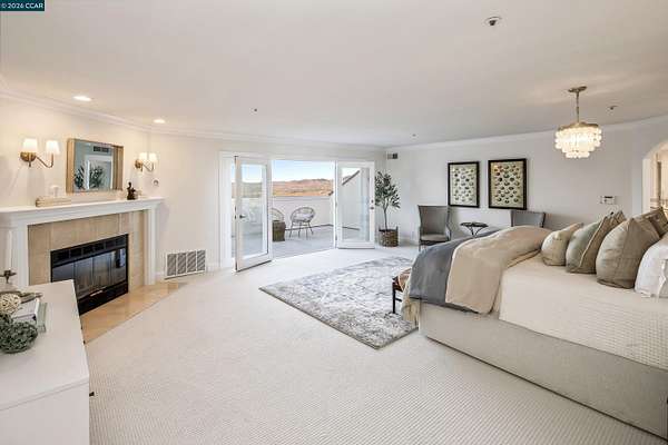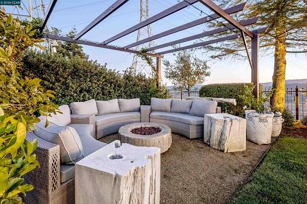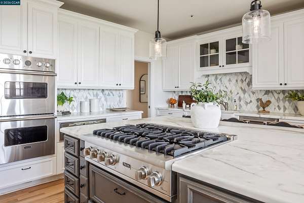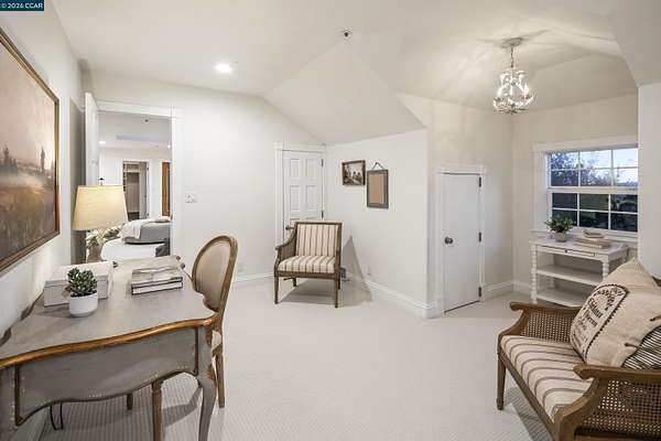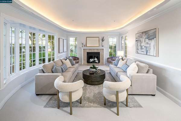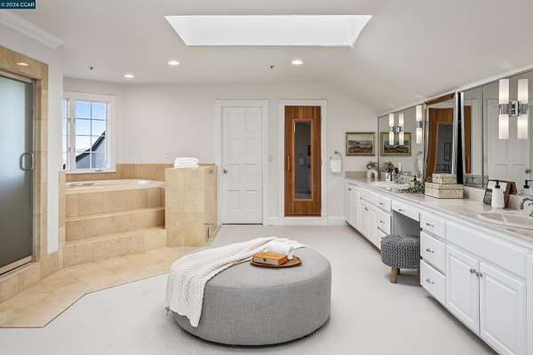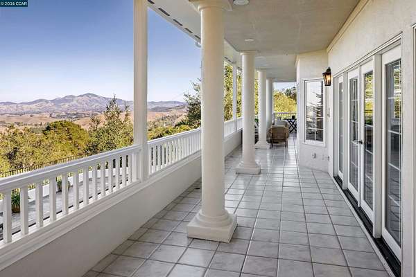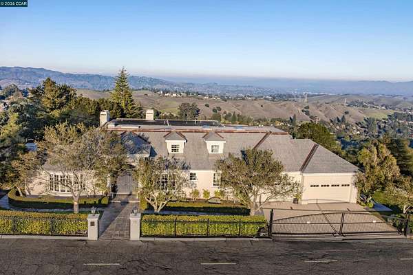 Perched atop the Orinda Oaks Open Space Preserve, this estate offers sweeping views of Mt. Diablo and the Berkeley hills. Mature oaks, Japanese maples, wisteria, lavender, roses, and other lush foliage flank the home. Step inside the foyer beneath 15-foot ceilings. To the left, a 360-sq-ft living room sits under a coffered ceiling; to the right, the dining room accommodates 10-12 with garden views. The kitchen features a large island with bar seating, a breakfast nook nestled into a bay window, 2 ovens, 2 sinks, 2 dishwashers, and ample counter space. Adjoining the kitchen, the family room spans more than 360 sq ft and includes a full wet bar. A 240-sq-ft office and large wraparound patio offer inspiring views-including glimpses of SF Bay. Four bedrooms are on the lower level, including a private guest/in-law suite or exercise room. The 460-sq-ft principal suite upstairs offers a marble fireplace, 2 walk-in closets, a nursery or exercise room, and a luxurious bath with steam shower, jacuzzi tub, sauna, dual vanities, and skylights. Outdoor living is equally distinguished with a covered swimming pool, built-in grill, and pergola-shaded lounge area with a new gas firepit overlooking the Preserve's natural splendor.