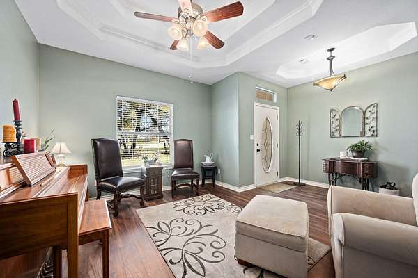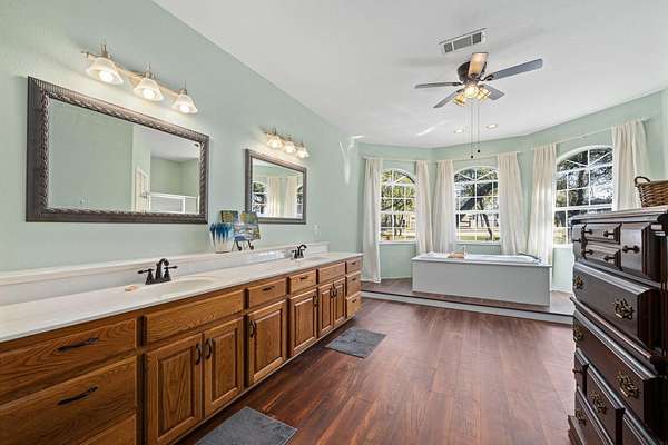 - Built-In Features, Ceiling Fan(s), Crown Molding, Double Vanity, Kitchen Island, No Interior Steps, Open Floorplan, Pantry, Primary Bedroom On Main, Recessed Lighting, Soaking Tub, Tray Ceiling(s), Walk-In Closet(s)