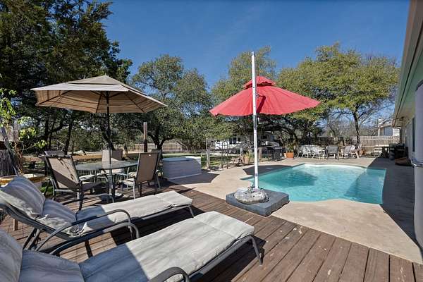 Nestled on a private, tree-dotted 1.87-acre lot, this beautifully maintained property offers the rare combination of peaceful country living and modern convenience-with NO HOA, giving you the freedom to truly make it your own. Thoughtfully updated for peace of mind, major improvements include a roof replaced in 2020, a water softener replaced in 2023, HVAC in 2024, and a brand-new septic pump in 2025. Inside, a well-designed floor plan welcomes you with abundant natural light and gorgeous luxury vinyl plank flooring installed in 2021. The spacious living room, anchored by a cozy fireplace, flows seamlessly into the kitchen featuring expansive countertops, a center island, abundant stained wood cabinetry with pull-out drawers, stainless steel appliances, and a pantry, all complemented by a nearby dining area perfect for everyday meals or entertaining. A flex space with a striking tray ceiling and French doors makes an ideal home office or creative retreat. The generous primary suite also showcases a tray ceiling, direct access to the sunroom, and an ensuite bath complete with an expansive dual vanity, soaking tub, separate shower, and walk-in closet. Two additional sizable bedrooms offer flexibility for guests and share a well-appointed full bath, while an additional half bath adds everyday convenience. The living space extends into a spacious sunroom-perfect for relaxing, enjoying hobbies, or simply taking in the serene surroundings. Step outside to your own backyard oasis featuring a pool, multiple seating areas, raised garden beds, and wide-open space to roam, expand, or customize to your vision. An RV carport with full utility hookups adds even more versatility. Ideally located just a short drive to Lake Georgetown, the airport, and a variety of shopping, dining, and recreation options, with easy access to TX-195 and I-35, this exceptional property delivers privacy, freedom, and functionality all in one remarkable package.