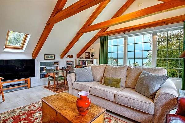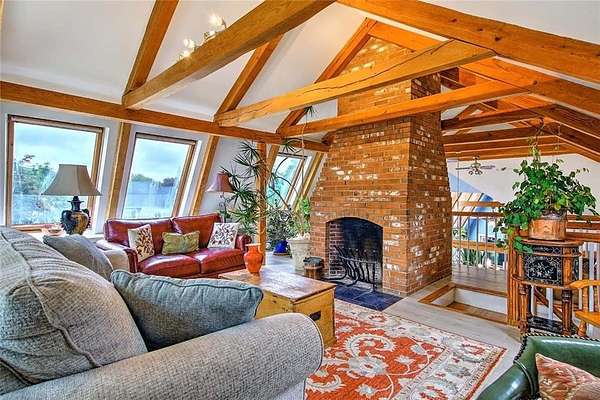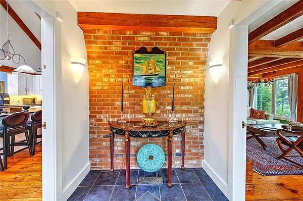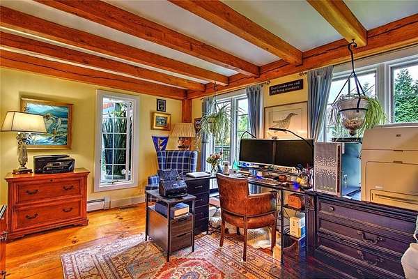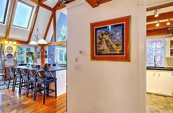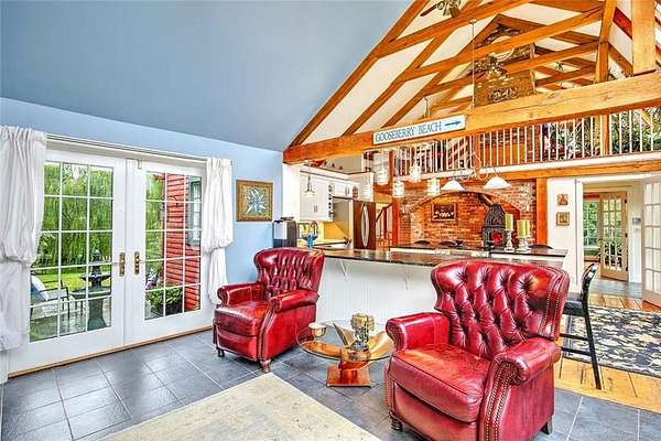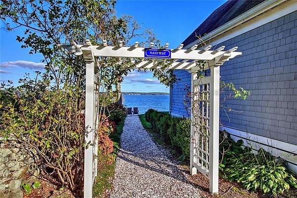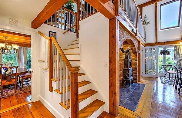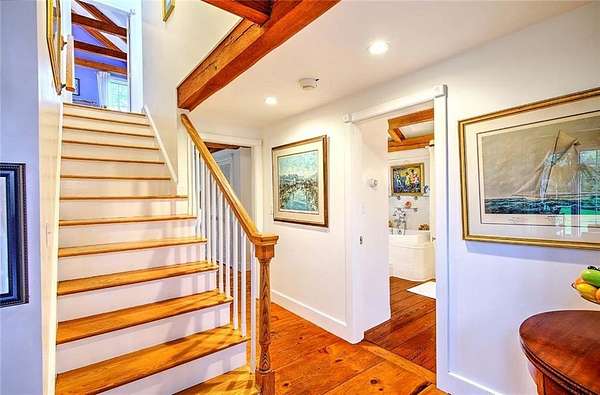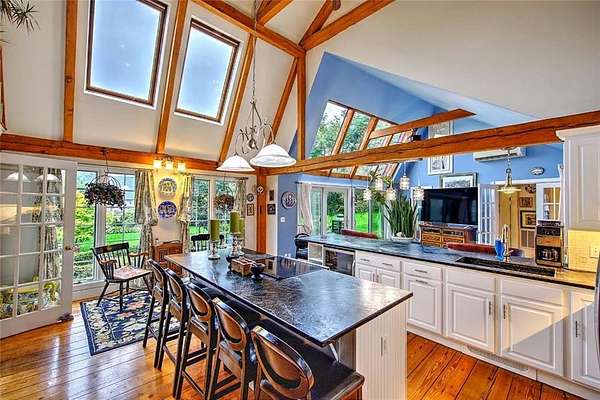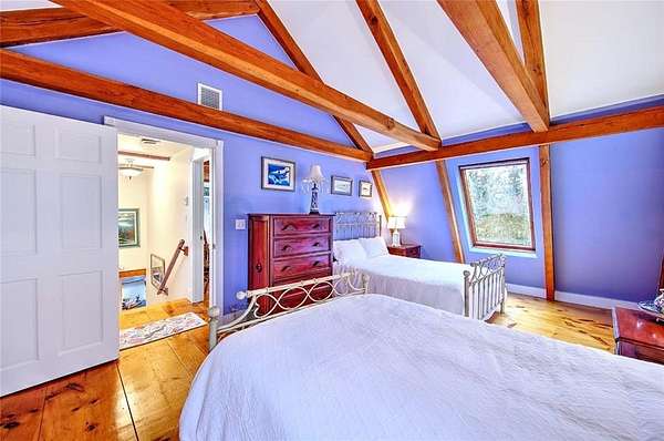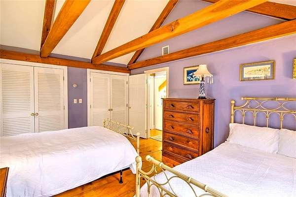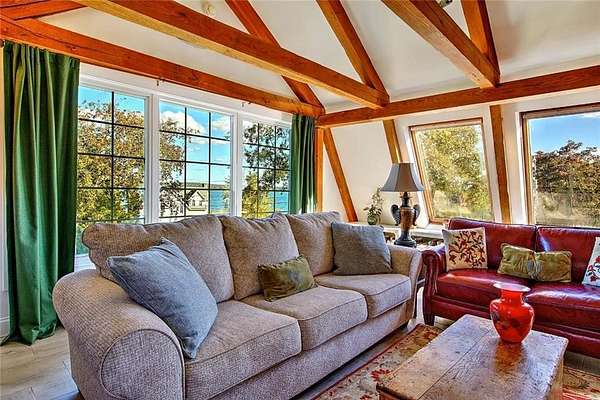 This one-of-a-kind hand-crafted post-and-beam home, named "Sakonnet Shores," is a rare blend of artistry, sustainability, and connection to the land and sea. Built with traditional timber-frame techniques - without a single nail - the red oak beams were sourced from Massachusetts, hand-cut with wooden pegs, and raised on-site in the tradition of Amish barns. Red cedar siding, wide-plank antique pine floors milled from historic Fall River beams, and exposed timber throughout create warmth and timeless beauty. Built with SIP panels, solar design, and participation in the RI Energy program, the home is both efficient and income-generating. Natural light pours in through Pella and Andersen windows, French doors, sliders, and 10 skylights that frame saltwater views. Modern comforts include two dishwashers, dual laundry areas, a chef's kitchen with cathedral ceilings, soapstone counters, bar seating for 12, and a walk-in pantry. The primary suite offers a spa bath, private patio, and outdoor shower, complemented by additional bedrooms, flexible office space, and multiple patios for entertaining. Fireplaces in the living room and upper salon invite cozy gatherings, while the lower-level gym doubles as a fifth bedroom with a sauna and steam shower. The 1.68-acre grounds feature flowering trees, hydrangeas, and saltwater frontage with rights to two moorings. Just minutes to Newport and 30 minutes to Providence, it's a rare coastal retreat.