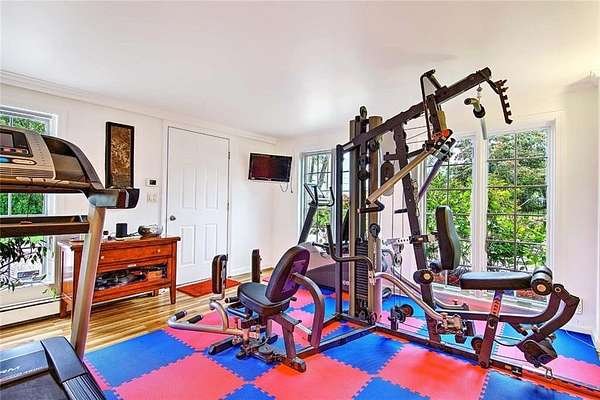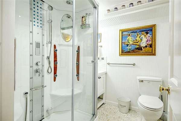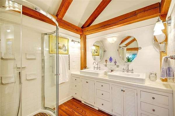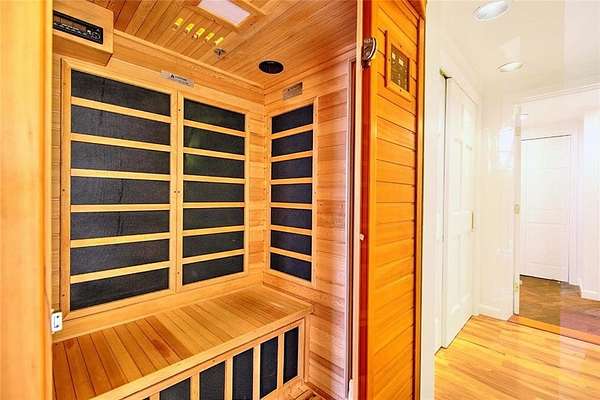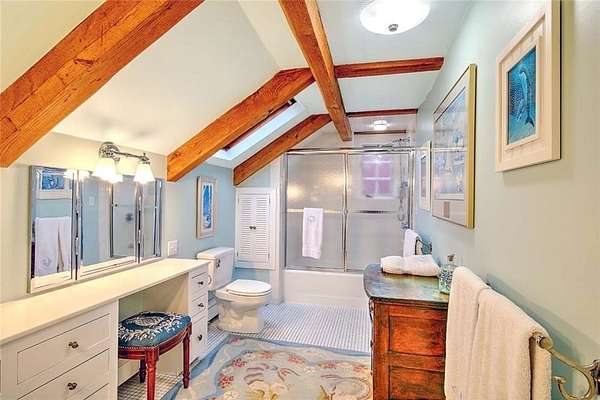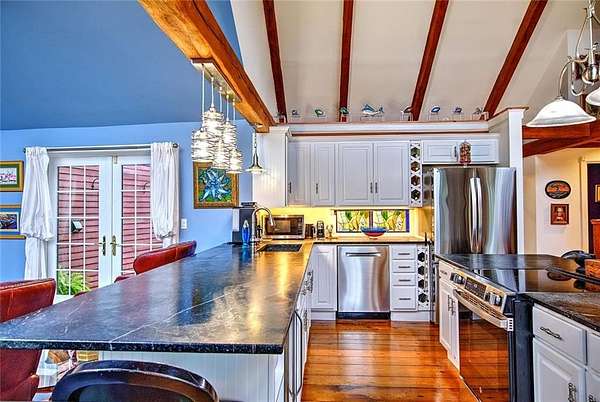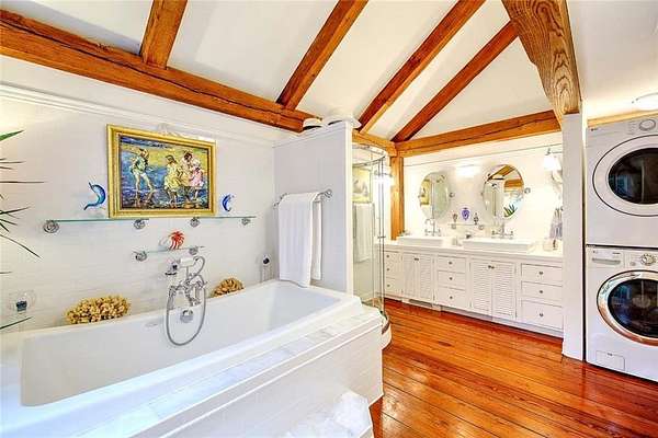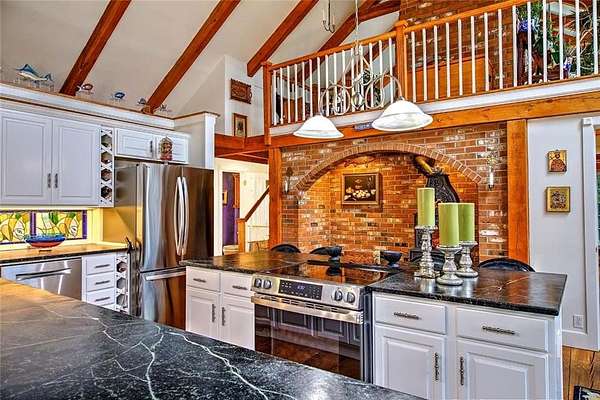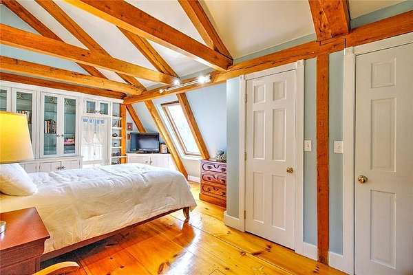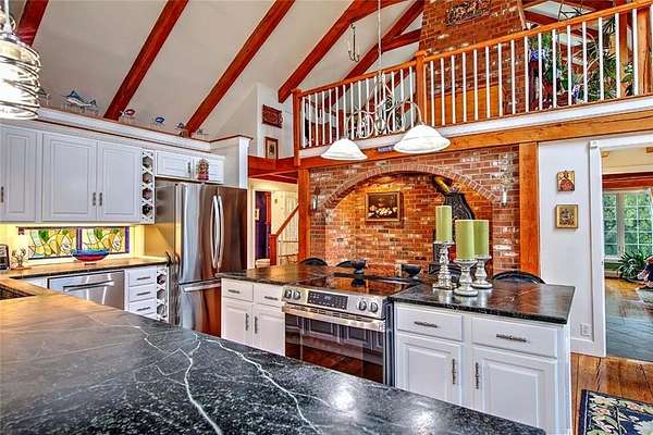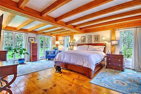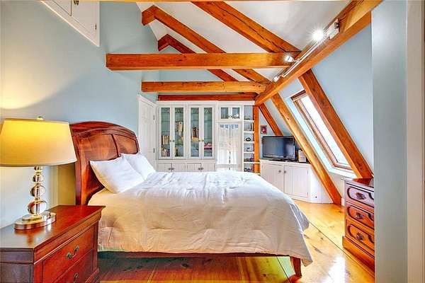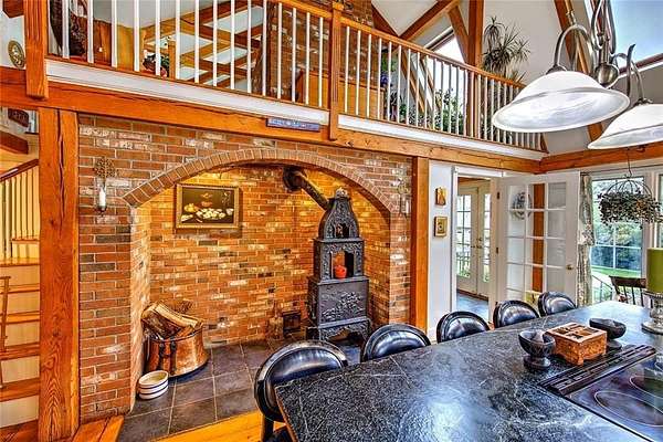 This one-of-a-kind hand-crafted post-and-beam home, named "Sakonnet Shores," is a rare blend of artistry, sustainability, and connection to the land and sea. Built with traditional timber-frame techniques - without a single nail - the red oak beams were sourced from Massachusetts, hand-cut with wooden pegs, and raised on-site in the tradition of Amish barns. Red cedar siding, wide-plank antique pine floors milled from historic Fall River beams, and exposed timber throughout create warmth and timeless beauty. Built with SIP panels, solar design, and participation in the RI Energy program, the home is both efficient and income-generating. Natural light pours in through Pella and Andersen windows, French doors, sliders, and 10 skylights that frame saltwater views. Modern comforts include two dishwashers, dual laundry areas, a chef's kitchen with cathedral ceilings, soapstone counters, bar seating for 12, and a walk-in pantry. The primary suite offers a spa bath, private patio, and outdoor shower, complemented by additional bedrooms, flexible office space, and multiple patios for entertaining. Fireplaces in the living room and upper salon invite cozy gatherings, while the lower-level gym doubles as a fifth bedroom with a sauna and steam shower. The 1.68-acre grounds feature flowering trees, hydrangeas, and saltwater frontage with rights to two moorings. Just minutes to Newport and 30 minutes to Providence, it's a rare coastal retreat.