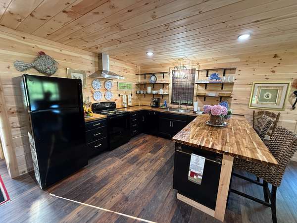 The kitchen is fully stocked and outfitted with custom butcher block countertops, crystal breakfast glasses, silver-plated flatware, and Pfaltzgraff dinnerware.