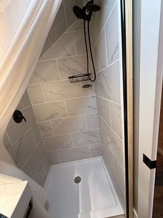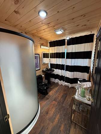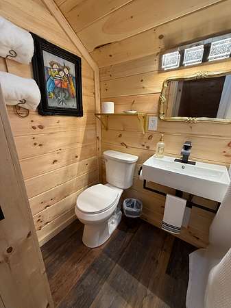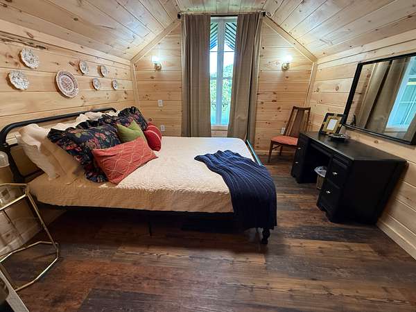 The cabin includes 3 bedrooms and 2 bathrooms, with custom wood finishes throughout. There is a king bed in the primary suite and queen beds in the others. Each room is complete with a personalized vanity table.