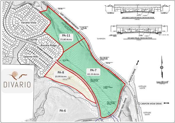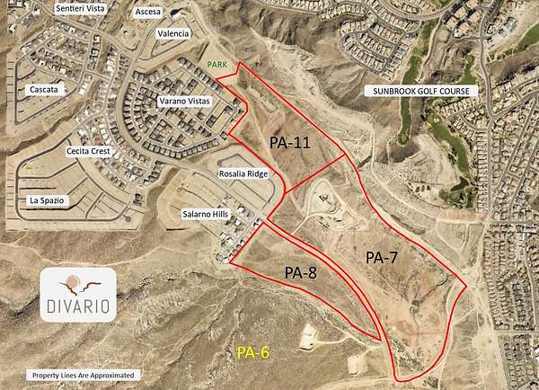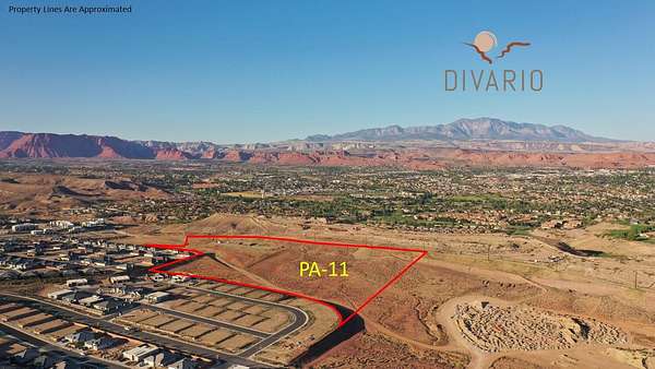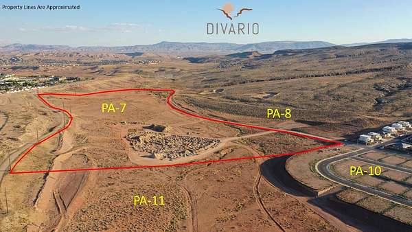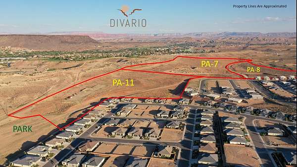 Planning Areas (PA's) 7 & 11 in Divario is medium density residential ground comprised of 91.13 gross acres with 63.02 developable acres and 28.11 acres of open space. The zoning will support 568 residential units. The 91 acres border Gap Canyon Parkway on the north and Divario Canyon Drive on the south. Divario is a 730 acre mixed use master planned community, including two parks, with 3,196 residential units at full build-out. Located adjacent to Sunbrook Golf Course, in west St. George. Utilies will be located in the adjacent road and road to be paved to the entry. Taxes are estimated based on pro rata share of master parcels.