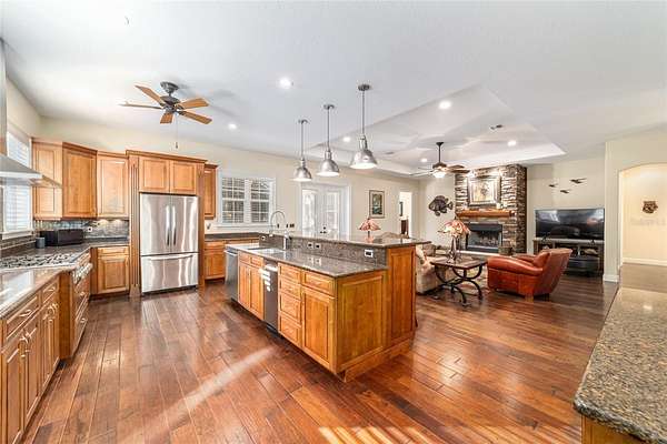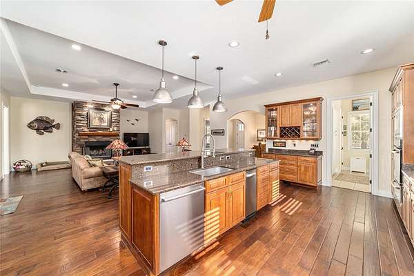 - Ceiling Fans(s), High Ceilings, Kitchen/Family Room Combo, Open Floorplan, Primary Bedroom Main Floor, Solid Surface Counters, Solid Wood Cabinets, Split Bedroom, Stone Counters, Thermostat, Tray Ceiling(s), Walk-In Closet(s), Window Treatments