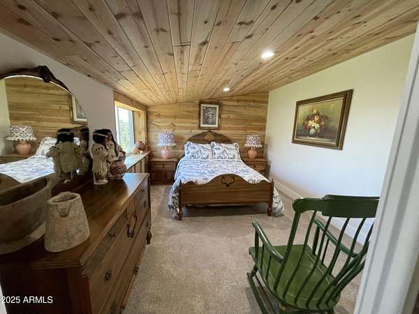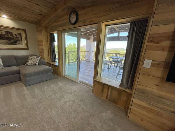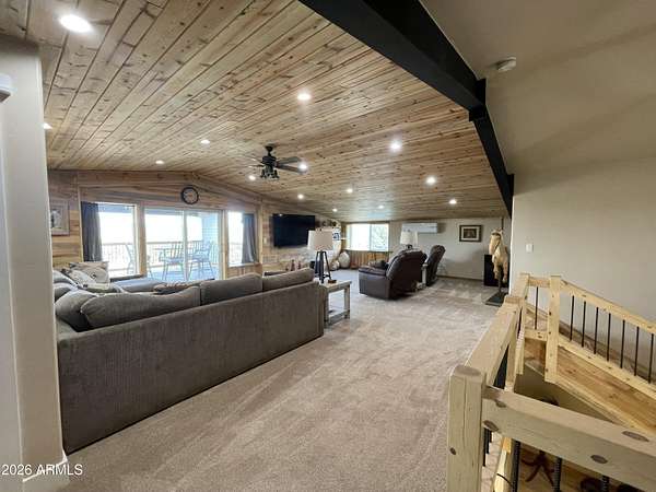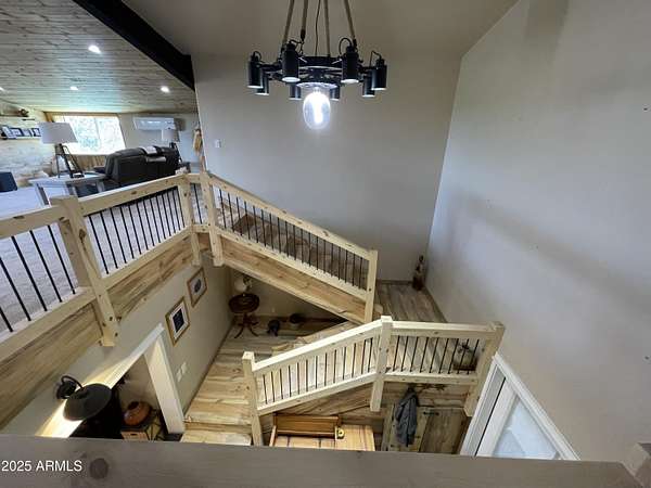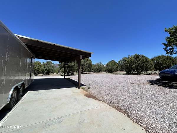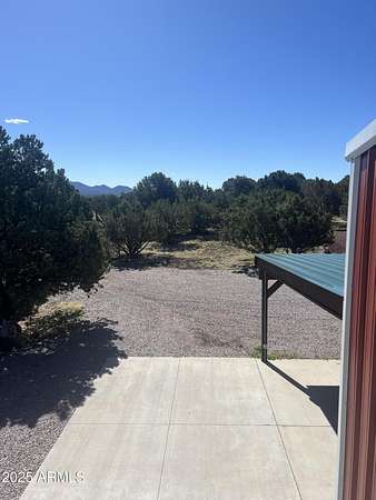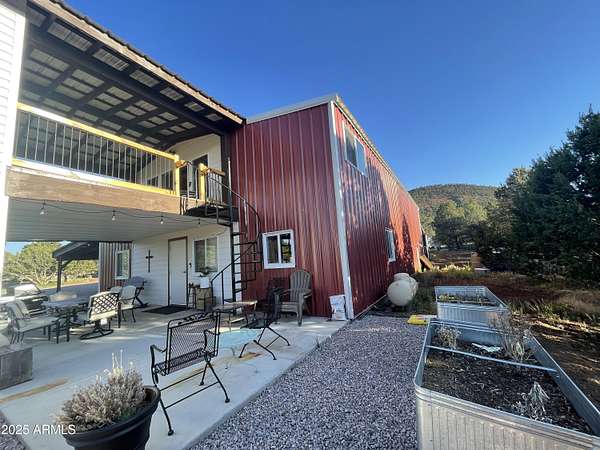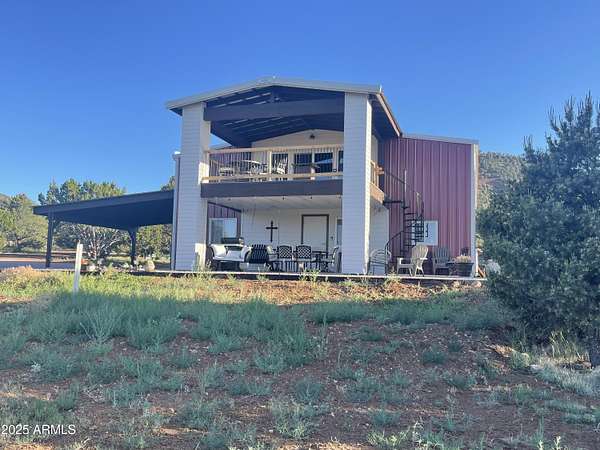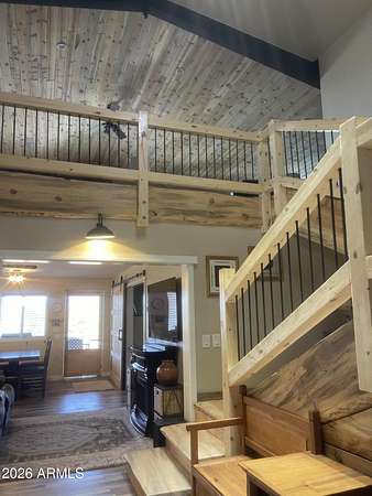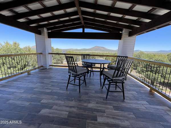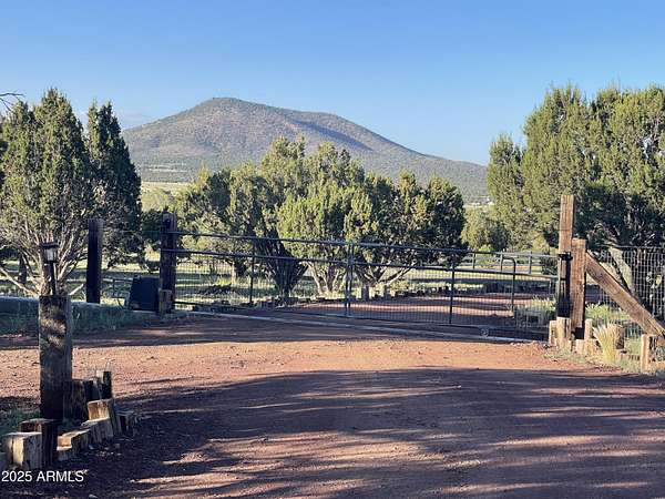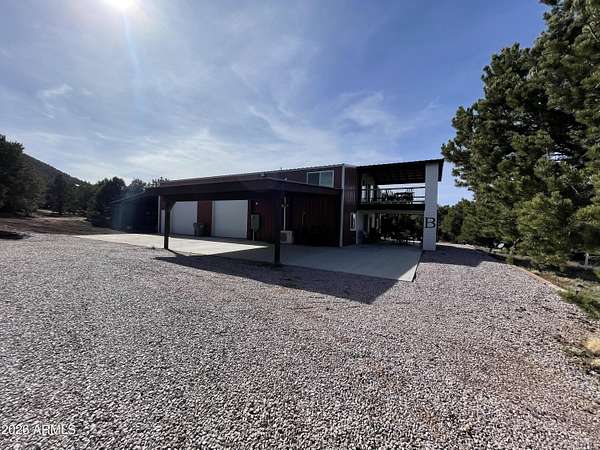 Exquisite 2 story Custom Home with covered balcony and decks to enjoy your 7.6 acres of Beautiful Pines, Mountain View's and Spectacular Sunsets. Kitchen features butcher block and quartz countertops, beverage bar, moveable island & breakfast bar. Magnificent Ponderosa Pine live edge stair case to upper level (ceiling knotty beetle pine)of living room, bedrooms and bath. Hidden door access to 3rd Bedroom currently used as office. Each room has beautiful views. LR leads to covered balcony with San Francisco Peaks View! Ext/ spiral wrought iron staircase. Extended Garage, has RV doors. Carport cover includes attached 40 ft conex with power. 2500 gallon Cistern, 1500 gallon septic which will allow you to add on or build a guest house. Fenced and Gated for privacy.