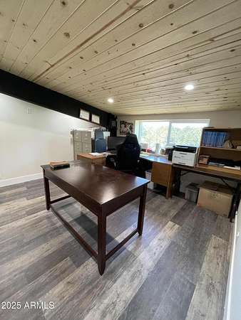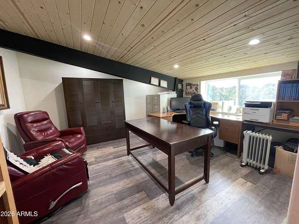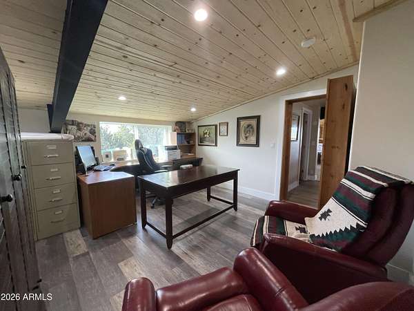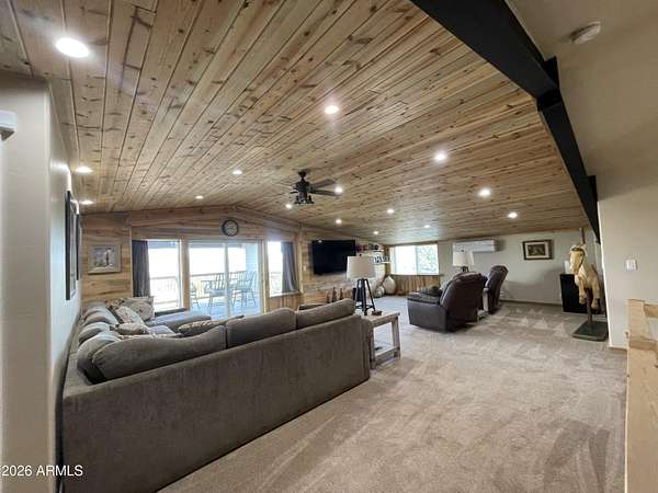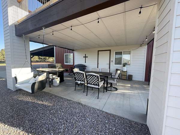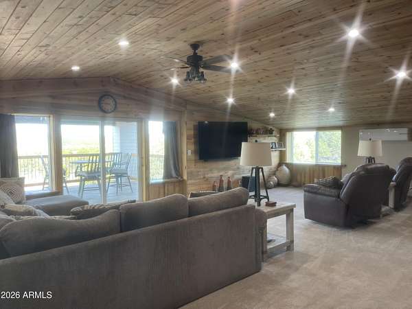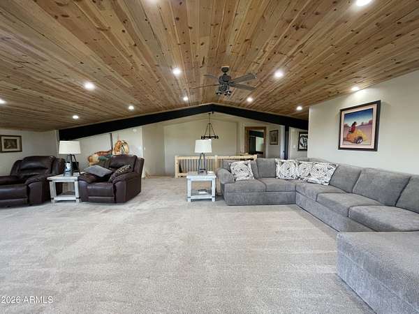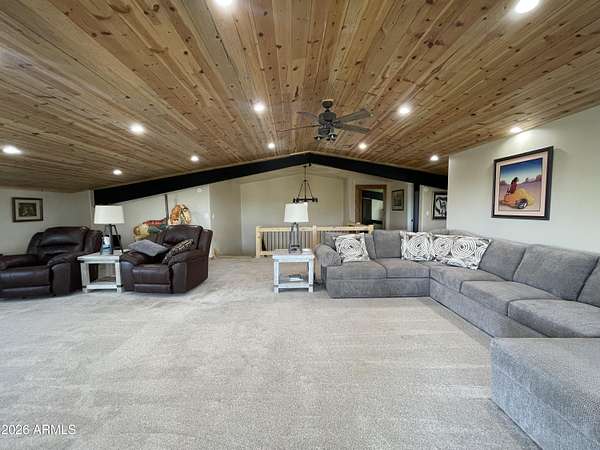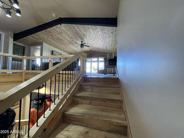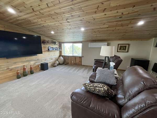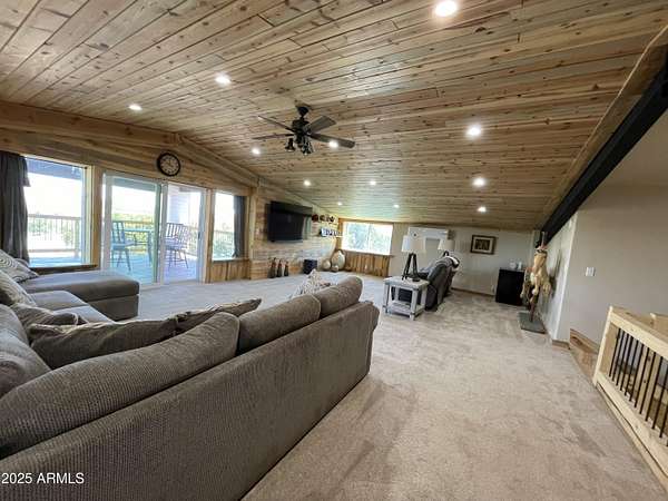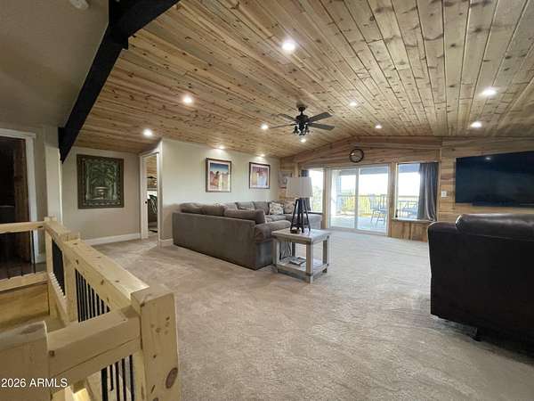 Exquisite 2 story Custom Home with covered balcony and decks to enjoy your 7.6 acres of Beautiful Pines, Mountain View's and Spectacular Sunsets. Kitchen features butcher block and quartz countertops, beverage bar, moveable island & breakfast bar. Magnificent Ponderosa Pine live edge stair case to upper level (ceiling knotty beetle pine)of living room, bedrooms and bath. Hidden door access to 3rd Bedroom currently used as office. Each room has beautiful views. LR leads to covered balcony with San Francisco Peaks View! Ext/ spiral wrought iron staircase. Extended Garage, has RV doors. Carport cover includes attached 40 ft conex with power. 2500 gallon Cistern, 1500 gallon septic which will allow you to add on or build a guest house. Fenced and Gated for privacy.