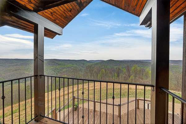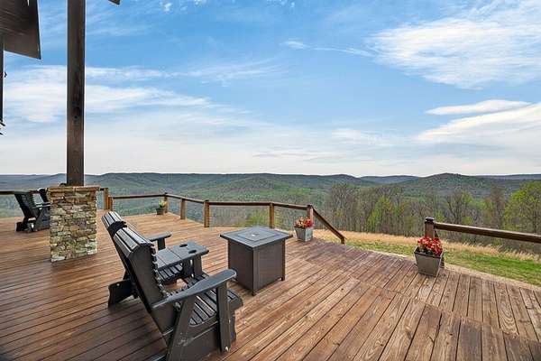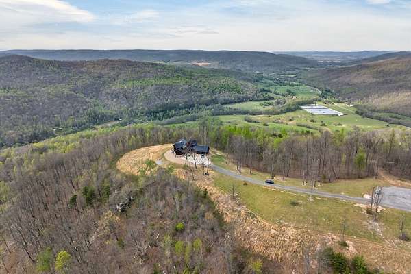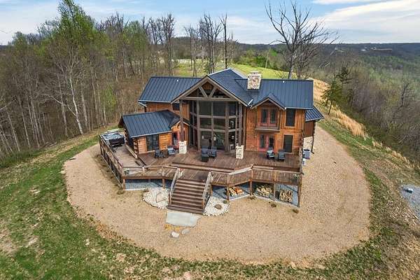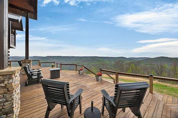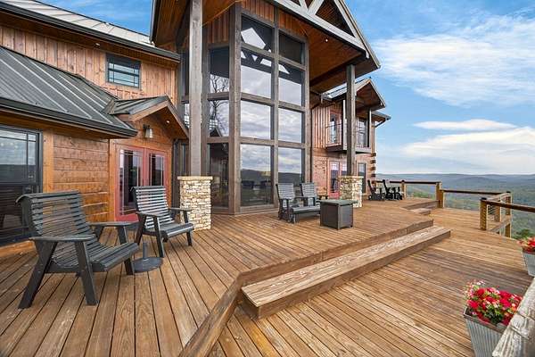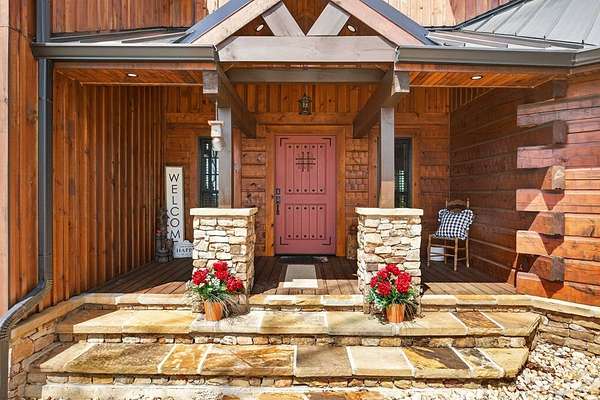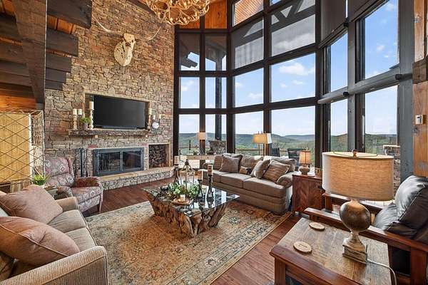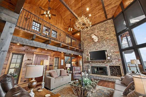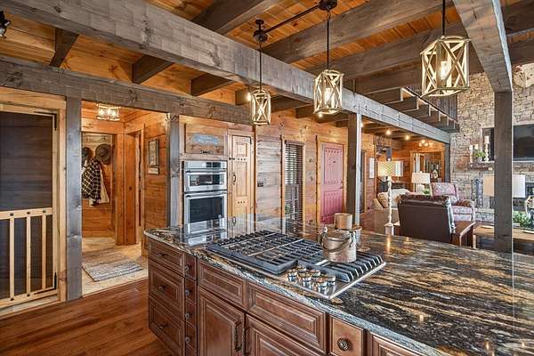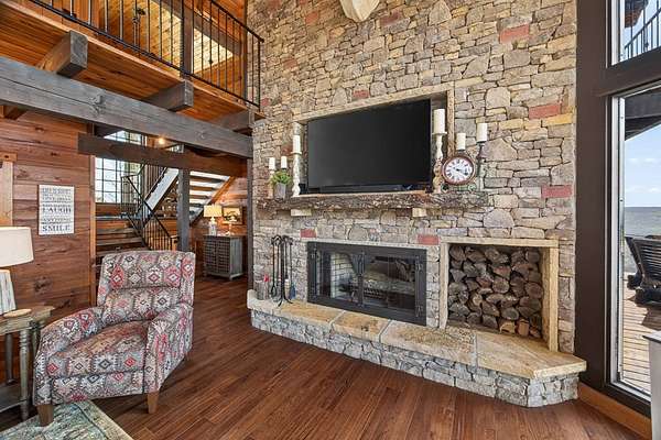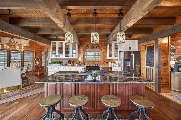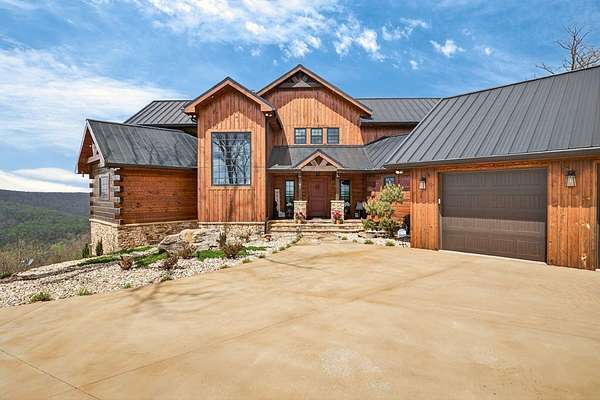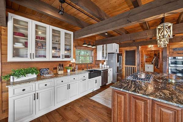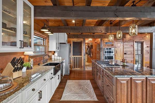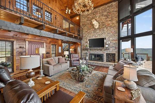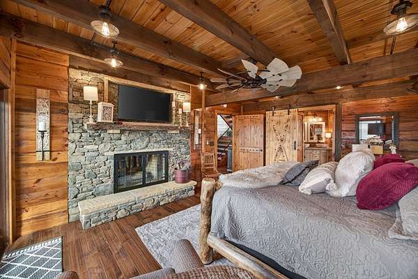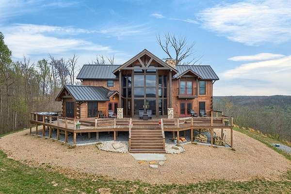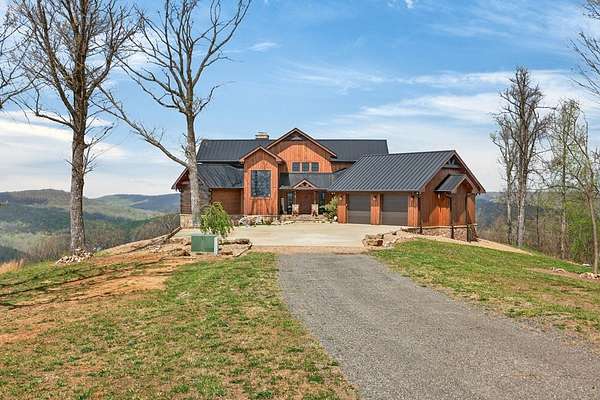 The end of the road is just the beginning at this private 7.51-acre retreat delivering panoramic mountain views with the feel of a luxury Smoky Mountain chalet, without the crowds. This hybrid log and board-and-batten home offers 2,684 sqft of thoughtfully designed living space plus 1,700 sqft of outdoor living space. Inside, you'll find hardwood floors, expansive windows, and a stunning floor-to-ceiling stone fireplace anchoring the main living area. The gourmet kitchen features granite countertops and KitchenAid stainless steel appliances, ideal for entertaining. Each of the three bedrooms includes a private ensuite, while the primary suite offers a second fireplace. A built-in security system, custom remote-controlled blinds, and integrated complete exterior lighting with one flip of a switch add comfort and peace of mind. Every inch of this home reflects thoughtful craftsmanship and upscale quality.
