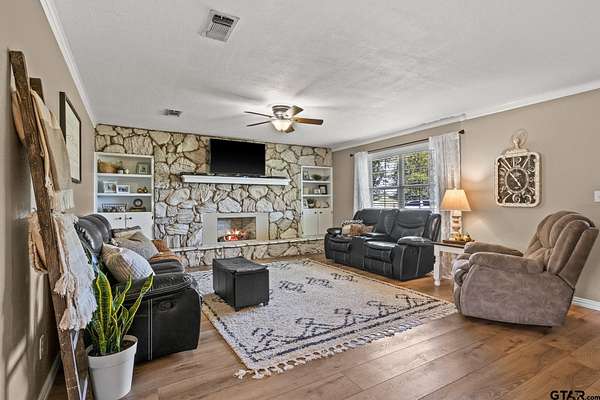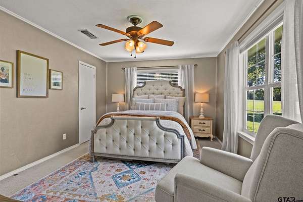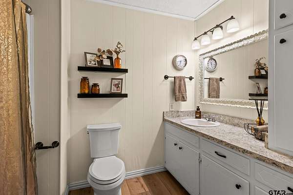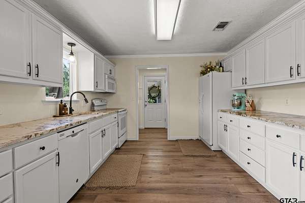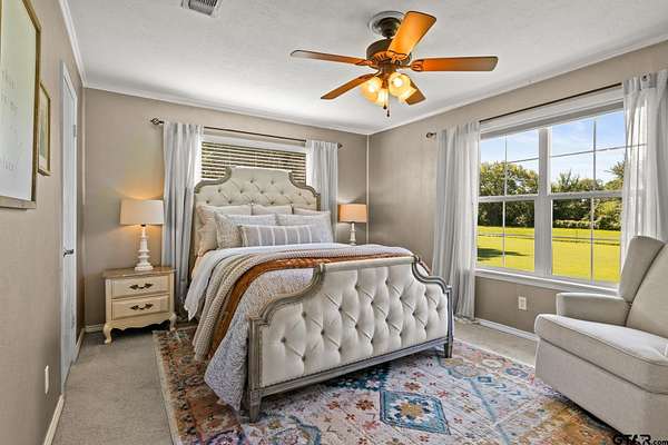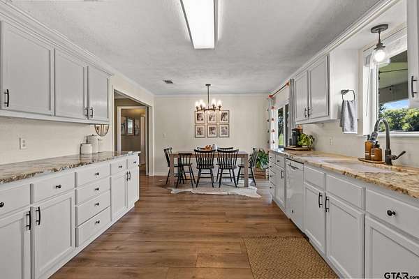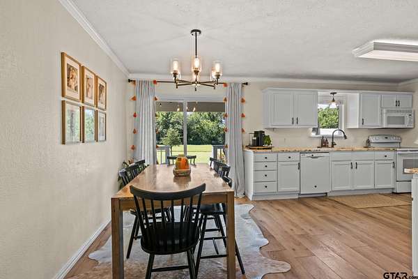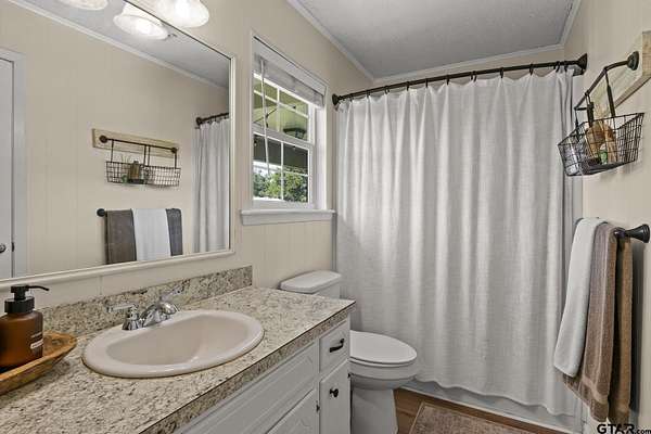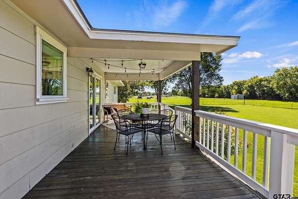 This property provides a tranquil setting ideal for individuals seeking residence just outside the city limits or those desiring a peaceful environment to raise a family. Imagine watching your horses run in the mornings while sipping coffee on the spacious back porch. This property overlooking 2.21 acres features 1,636 sq ft with three bedrooms and two full bathrooms. The living room is highlighted by a substantial rock fireplace, serving as a central focal point. The combined dining and kitchen area offers granite countertops, extensive cabinetry, a pantry area and washer and dryer connections that allows for direct carport access. Additional interior details include plank flooring, neutral paint tones, a barn door, and a distinctive accent wall. The expansive grounds accommodate a variety of uses, whether for gardening, animal care, or recreation, seamlessly blending rural appeal with contemporary comforts. Outdoor amenities include a 560 sq ft metal shop equipped with electricity and two additional outbuildings suitable for multiple purposes. Conveniently located minutes from Mt. Vernon ISD and downtown, the property affords easy access to local dining, shopping, and entertainment venues. Recreational opportunities such as Lake Cypress and Bob Sandlin are also nearby, providing options for fishing and other outdoor activities. Schedule a tour to experience everything this property has to offer.