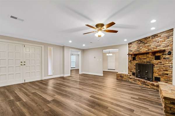 The interior showcases luxury vinyl plank flooring, sleek cabinetry, and updated appliances throughout. Bathrooms feature new tile and countertops, while the kitchen stands out with elegant slate countertops. Additional highlights include new interior doors, French patio doors, and a striking fireplace accented with Chicago pink brick, adding warmth and character to the living space.