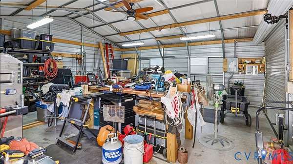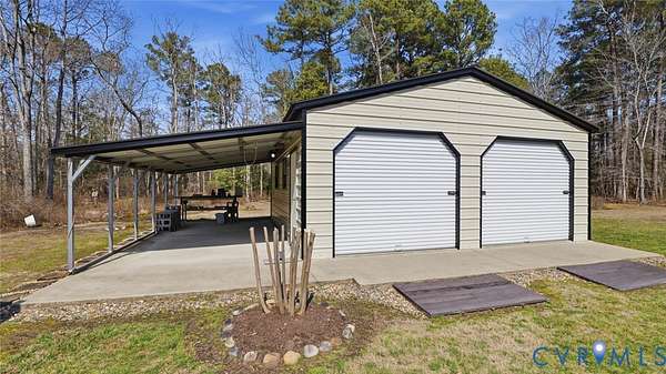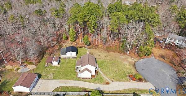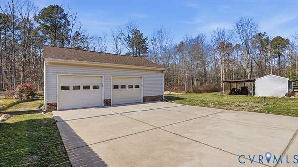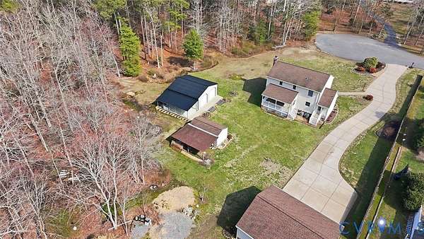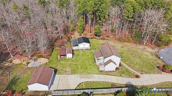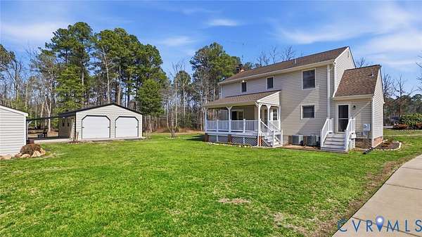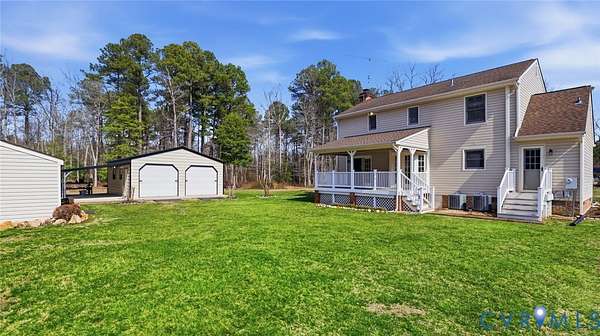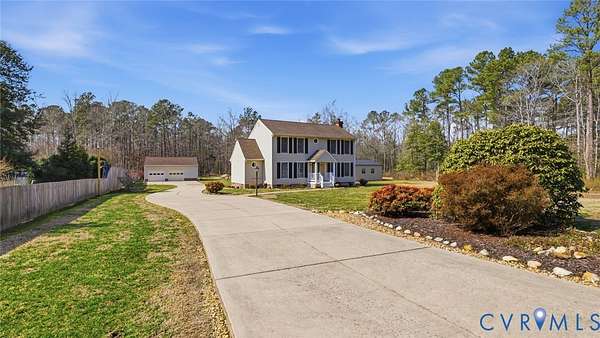 Beautifully situated 2-story colonial tucked at the end of a cul-de-sac on just under 3 acres, offering privacy, space, and an ideal mini-farm setting. Half of the property is cleared with the remaining acreage thoughtfully landscaped, creating a perfect blend of open land and natural beauty. This home features 3 spacious bedrooms, including a primary suite with walk-in closet and private ensuite bath. The front-to-back family room offers a brick fireplace, ceiling fan, and direct access to the outdoors, making it ideal for everyday living and entertaining. Additional highlights include a formal dining room, large utility room with rear access, walk-up attic storage with abundant space, and walk-in storage adjacent to bedroom two. The fireplace is plumbed to accept gas logs. Recent update includes a NEW 320' deep well. Sellers are offering a Flooring Allowance of $7,500. This home also features a 2-zone heat pump and a Water/Iron filtration system with water softner system. Enjoy outdoor living on the large covered deck with vinyl railing. A concrete double-width driveway provides ample parking. Car enthusiasts, hobbyists, and small farm lovers will appreciate the extensive outbuildings, including a 4-car detached garage with a 2.5-car standard bay (30x24), a 2-car garage with oversized doors (25x24), an attached carport (13x24), plus a detached shed (10x20) with lean-to (14x22). A rare opportunity for acreage living with exceptional storage, versatility, and privacy-all just minutes from everyday conveniences.